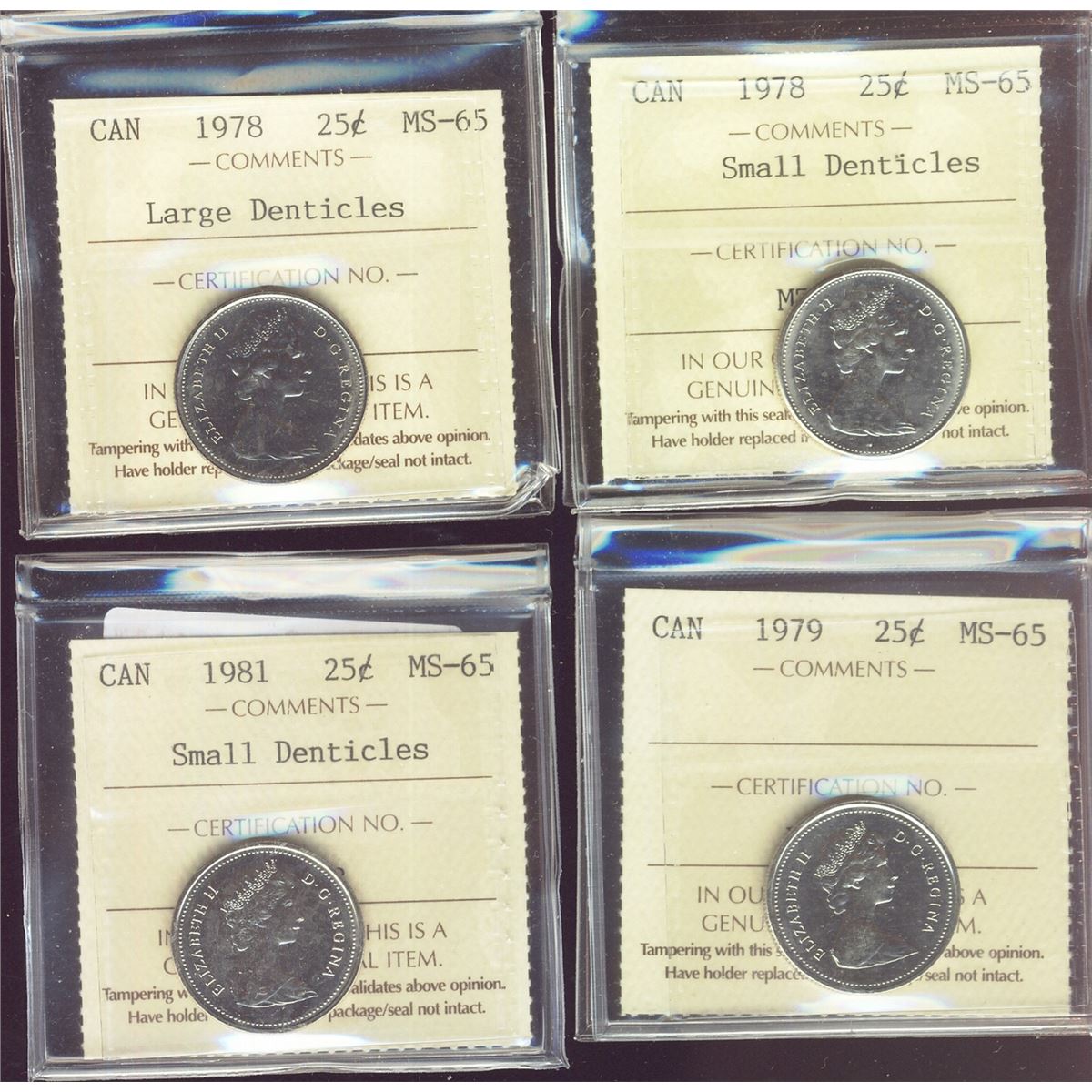 1978 25¢ Sml, 1978 Lg, 1979 & 1981 ICCS MS65. Lot of 4 coins.