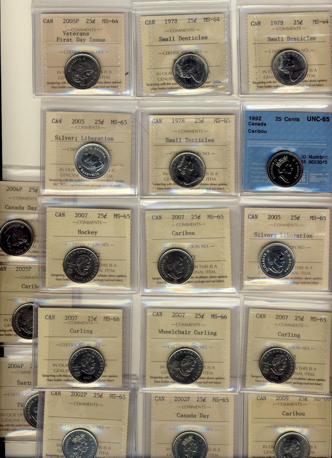 1978 25¢ Sml(2), 2005P Veterans MS64, 1978 Sml, 1992 caribou, 2005 Liberaton(2), 2005 Canada Day, 2002P, 2004P, 20055P Sask, 2005P Caribou, 2007 Caribou, Hockey, curling MS65 & 2007 curling, wheelchair, 2009 caribou MS66 along with 2004P Santa MS67.