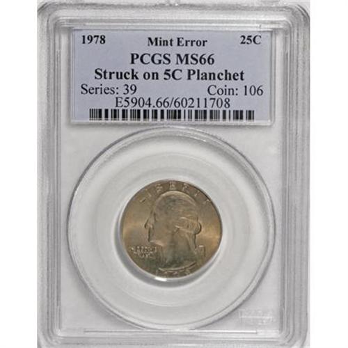 <B>1978 25C Washington Quarter--Struck on a 5C Planchet--MS66 PCGS.</B></I> <BR><BR><B>Coin Engraver:</B> John Flanagan<BR><BR><b>Shipping:</b> Coins & Currency (<a target="_blank" href="http://www.heritageauctions.com/common/shipping.php">view shipping information</a>)
