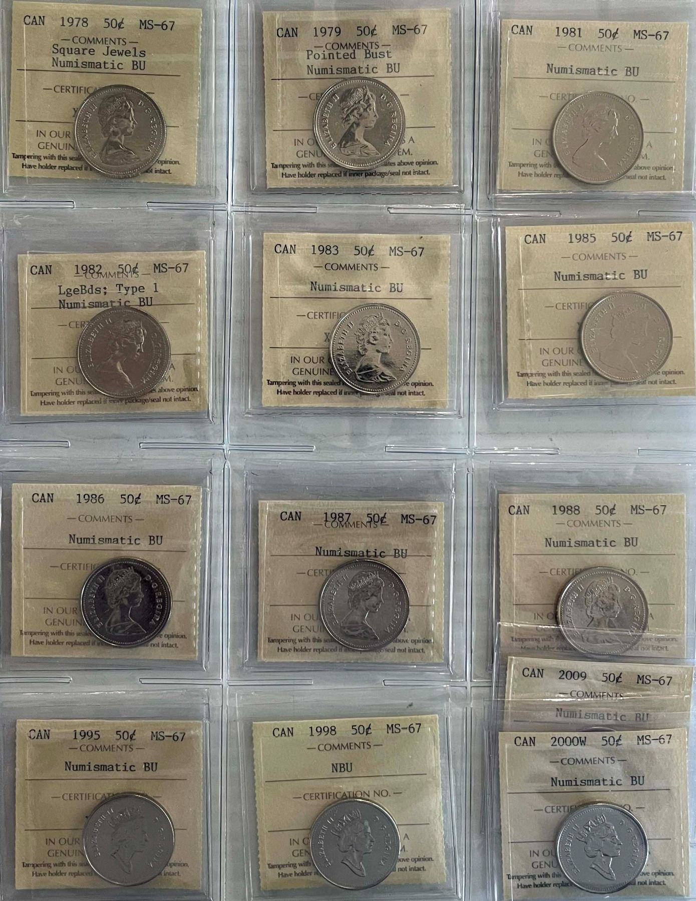 1978 50¢ to 2009 all ICCS Superb Gem Mint State-67 NBU. Lot of 13 coins.