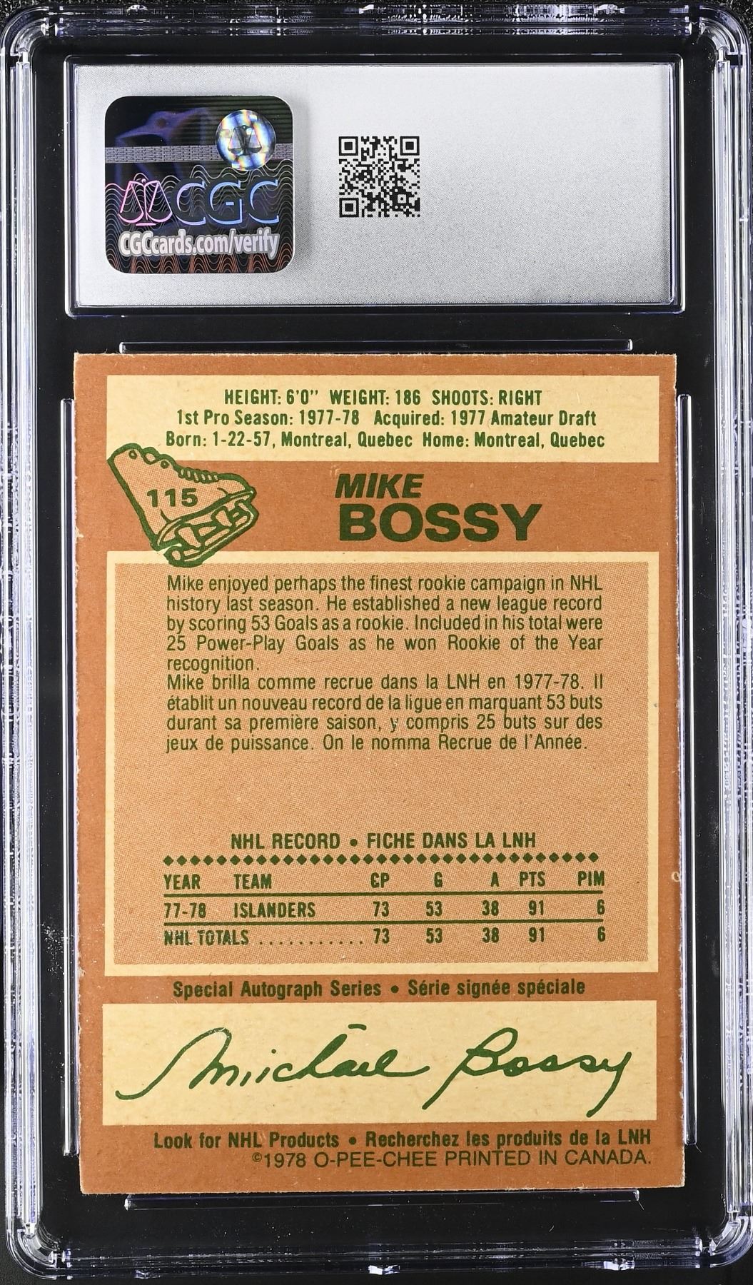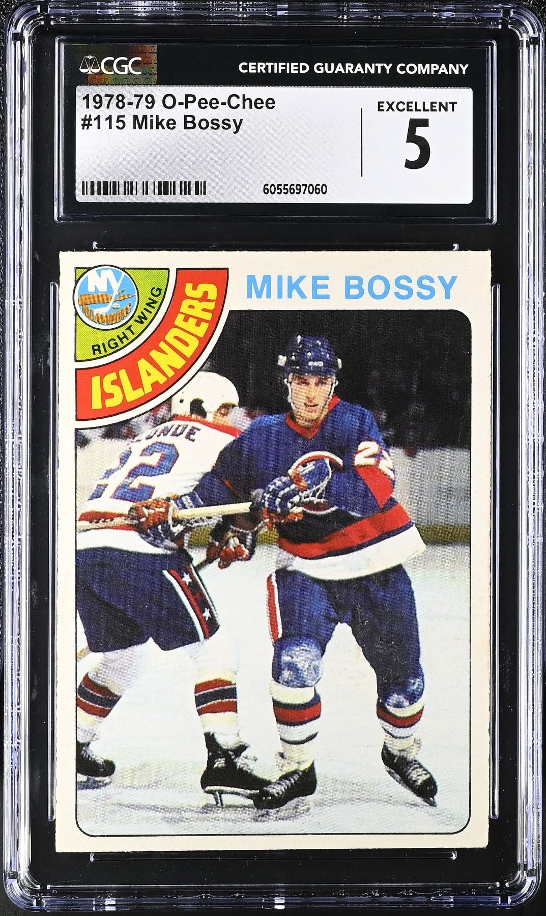 Rookie card of the greatest pure goal scorer in NHL history. HOFer Bossy broke in and scored 53 times as rookie, naturally winning Rookie of the Year. Injuries limited him to only 10 seasons and retirement at age 30, but in that time he would score 50 or more goals over nine consecutive seasons, including 60 or more five times (three straight at one point). He retired with 1,126 points (573 goals) in only 752 games, good for fourth all-time in terms of points-per-game behind Gretzky, Lemieux and McDavid. His .76 goals per game average is best all time. He would win four Stanley Cups with the Islanders, which included a three year stretch where he'd score 51 times in 56 post-season games. He would win the Conn Smythe Trophy as playoff MVP in 1982, three Lady Byng trophies and would receive five first-team all-star team selections. A true hockey great, this rookie card is graded 5 EX by CGC.
