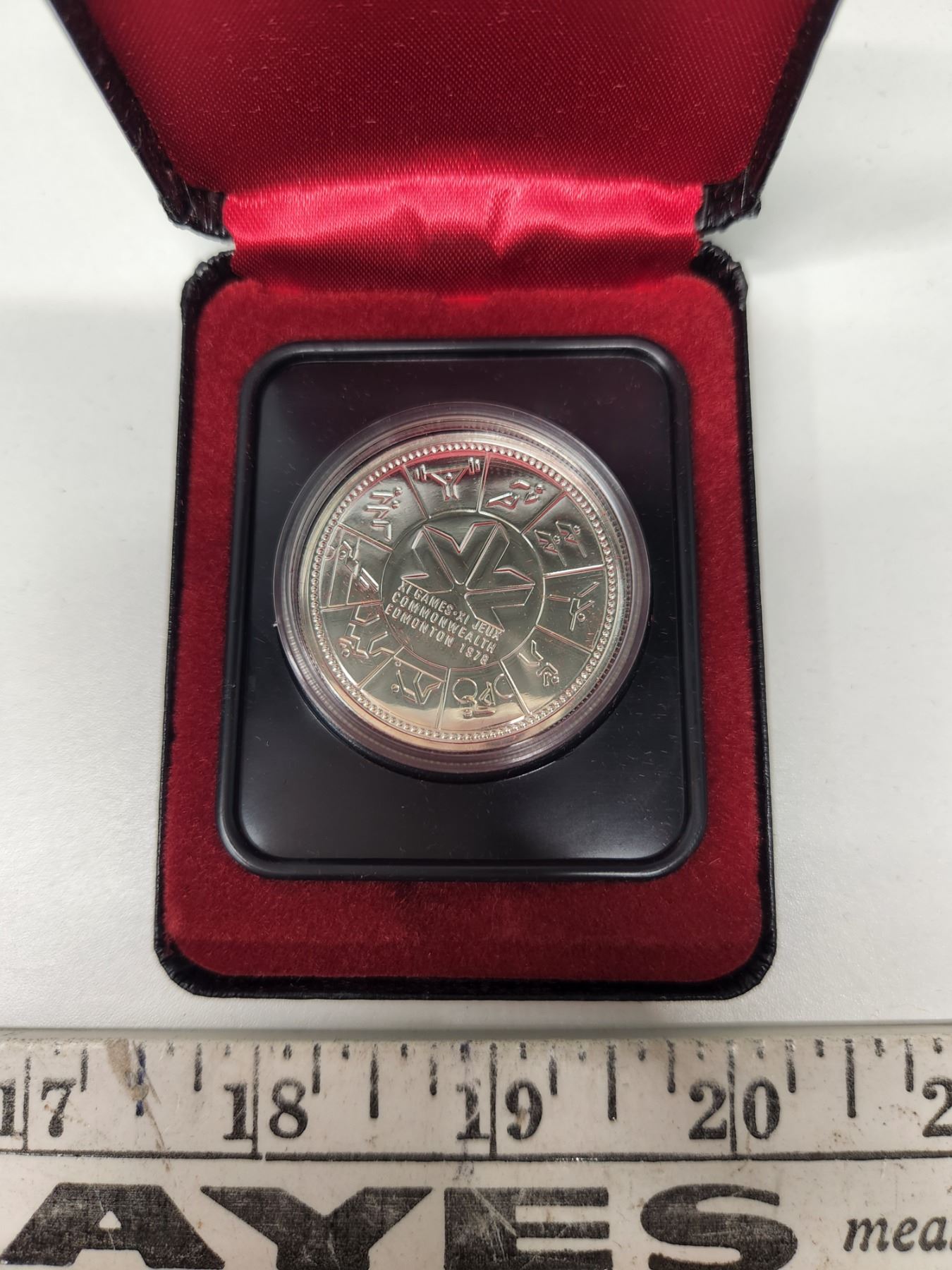 1978 Commonwealth Games Specimen Silver Dollar. Commemorates the 11th Commonwealth Games in Edmonton. Bright White. In black clamshell case of issue.