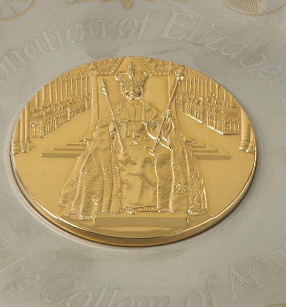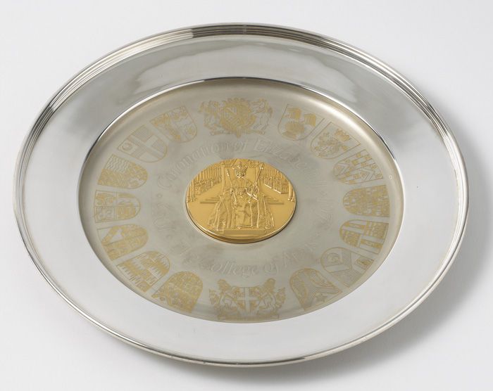 A large commemorative plate issued contained within a fitted holder. Obverse with gilt image of the Coronation of Elizabeth II and surrounded by coats of arms with gilt. The reverse with hallmark and the details of each coat of arms. 20.2 oz.