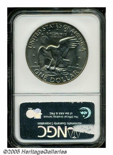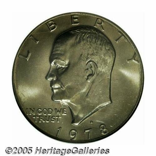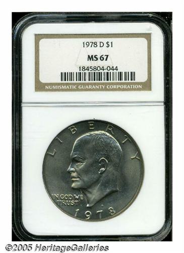 <B>1978-D<$1> MS67 NGC.</B></I> Denver struck more than 33 million Eisenhower Dollars in 1978, the last year of the series. Many if not most of these pieces, however, were abused by slot machines of the day. Mint State survivors are available, courtesy of mint sets, but locating unblemished examples with quality strikes is surprisingly difficult. This lustrous apricot-gold Superb Gem has both exemplary preservation and an imposing strike, and only a single PCGS MS67 challenges its status as finest certified. Population: 1 in 67, 0 finer (3/05).