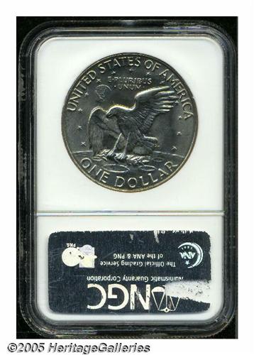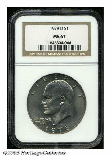 <B>1978-D<$1> MS67 NGC.</B></I> Denver struck more than 33 million Eisenhower Dollars in 1978, the last year of the series. Many if not most of these pieces, however, were abused by slot machines of the day. Mint State survivors are available, courtesy of mint sets, but locating unblemished examples with quality strikes is surprisingly difficult. This lustrous apricot-gold Superb Gem has both exemplary preservation and an imposing strike, and only a single PCGS MS67 challenges its status as finest certified. Population: 1 in 67, 0 finer (6/05).