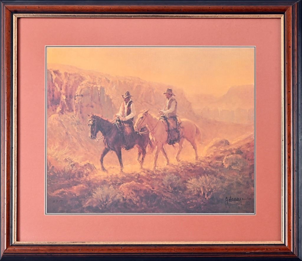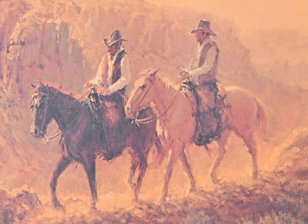 Two Cowboys on Horseback. AP 17. Print measures 20" x 16". Frame measures 29" x 25.5".