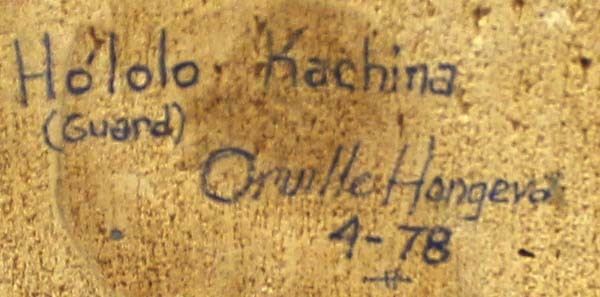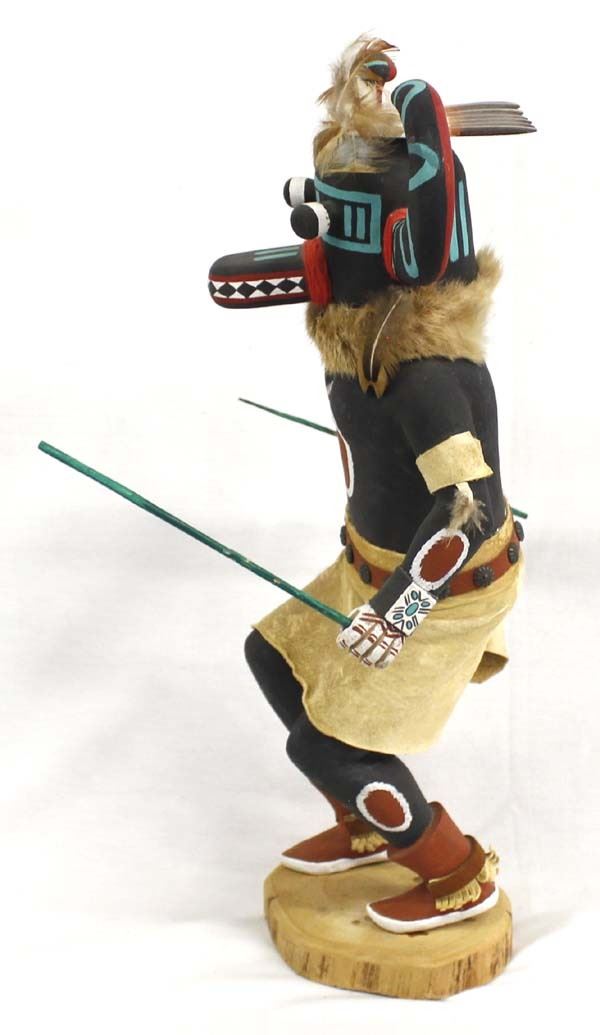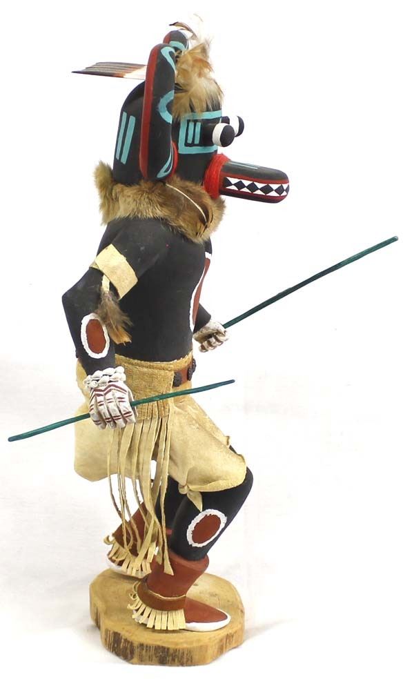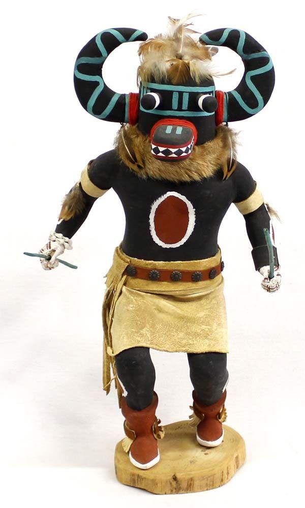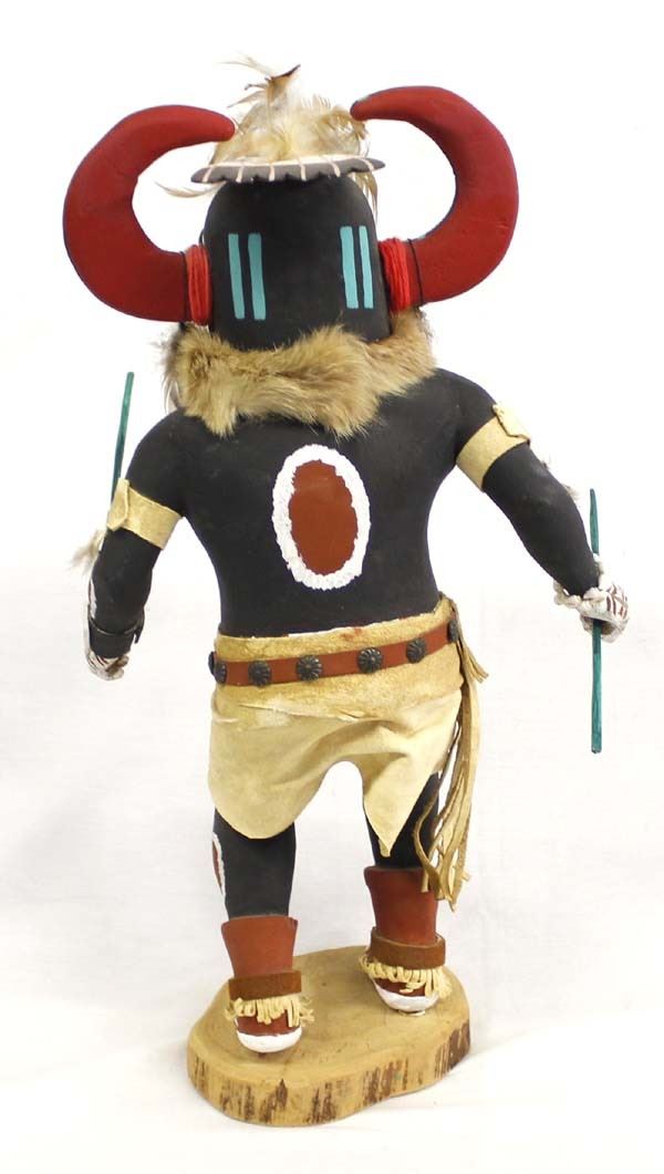1978 Native American Hopi Hololo ''Guard'' Kachina by Orville Hongeva, measures 18''H x 9.5''W x 9''Deep and is signed on the bottom, embellished with feathers, shells, leather, yarn, and rabbit fur, has been glued (both horns, wood feathers on the back of his head, and back onto the base)