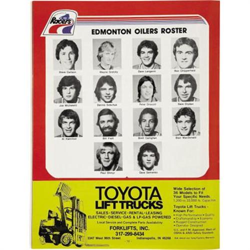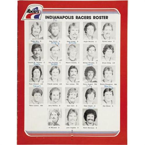 <B>1978 Indianapolis Racers Official Game Programs with Wayne Gretzky.</B></I> With stirring skills that many equated to a "magic touch," Wayne Gretzky was one of the most-celebrated hockey phenoms in memory by the time that he was 16, which ensued in his recruitment by a number of WHA teams. League rules prohibited the NHL from signing sub-18 year old players, resulting in the Great One signing with the WHA's Indianapolis Racers at age 17. But at the time the league, and the team, were floundering and Racers owner Nelson Skalbania was forced to sell Gretzky's rights to the Edmonton Oilers to make up for his financial troubles. As a result, the indomitable number 99 only logged eight games for the Racers, switching teams very early in the 1978-79 season. Here we present a collection of five official game programs from late 1978. One of the programs comes from one of the Great One's few games in Racers uniform and thus commands a premium as these are prized in the hobby. The other highlight of the lot comes with the December 10 program, which also features Gretzky in his return to Indy as a member of the Oilers. Some of the earliest professional acknowledgements from the man regarded as perhaps the best ever.<BR><BR><b>Shipping:</b> Books & Catalogs (<a target="_blank" href="http://www.heritageauctions.com/common/shipping.php">view shipping information</a>)