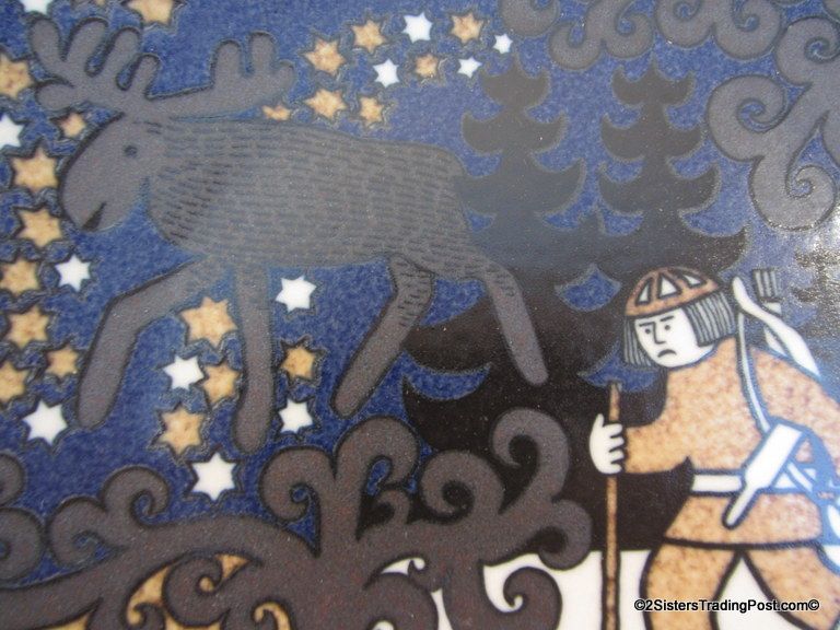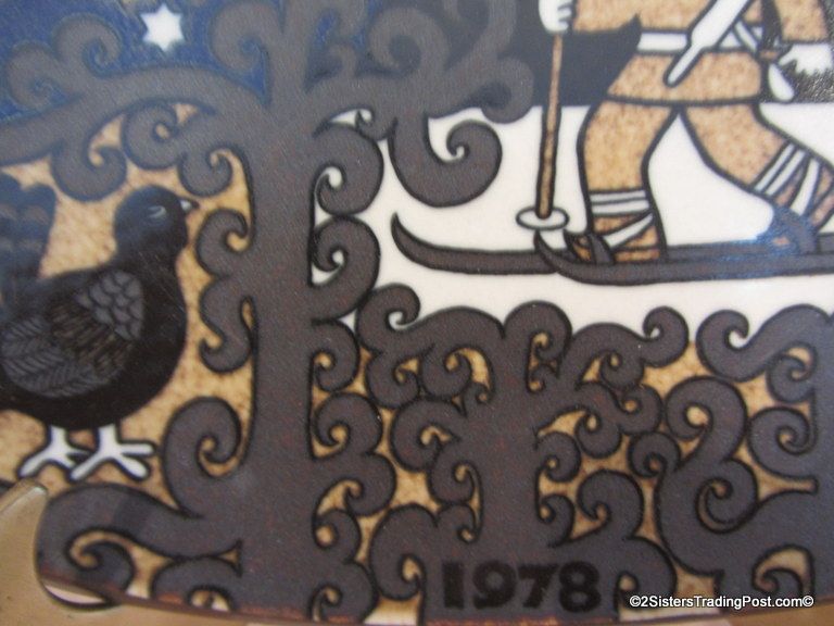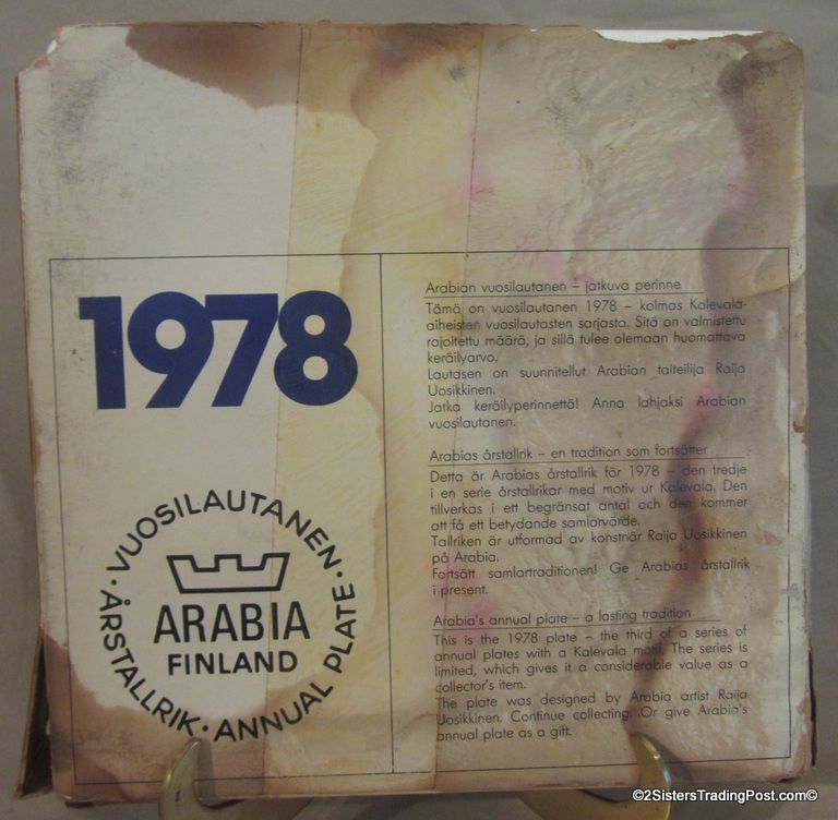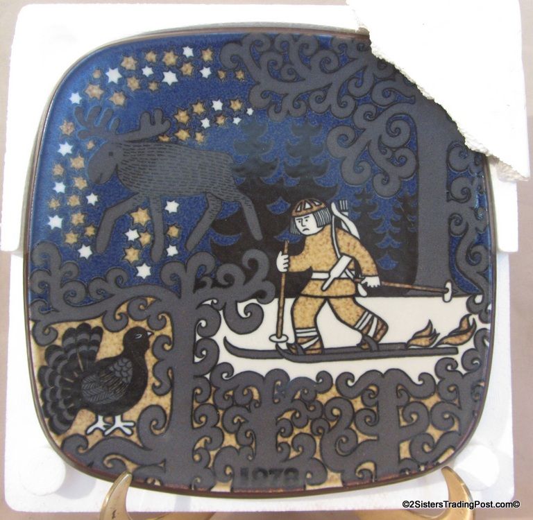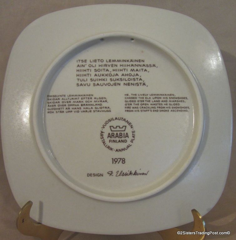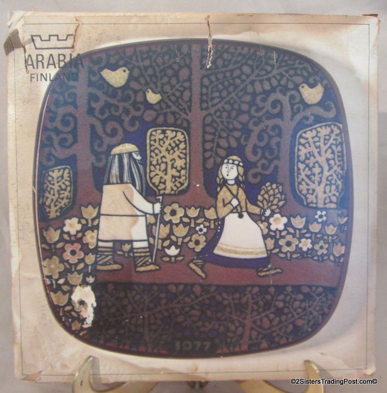 7 7/8" squared plate, dated 1978 Kalevala motif done on stoneware. This is the third plate in a series of 24 from Arabia Finland Kalevala Collection. Designed by artist Raija Uosiddinen. In the original descriptive sleeve and Styrofoam mailer no paperwork. (Please see images for details).