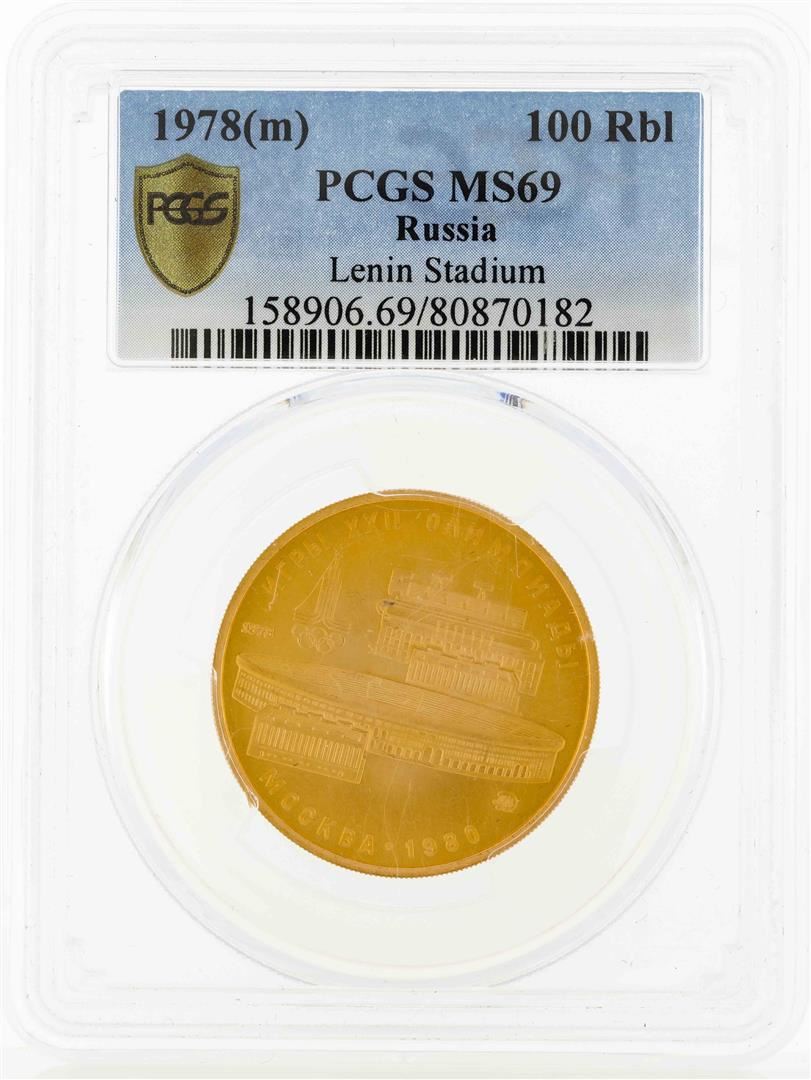 One 1978 M Russia Moscow Olympic USSR 100 Roubles Gold Coin PCGS MS69. PCGS Certified.