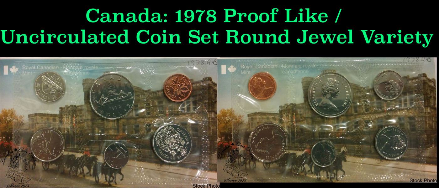1978 Proof Like / Uncirculated Coin Set Round Jewel Variety. 978 Proof Like set. Included are $1, 50 cent, 25 cent, 10 cent, 5 cent, and penny coins. Round jewel variety. The coins are sealed in transparent plastic. They are presented in a envolope, and accompanied by a card which shows coin specifications.