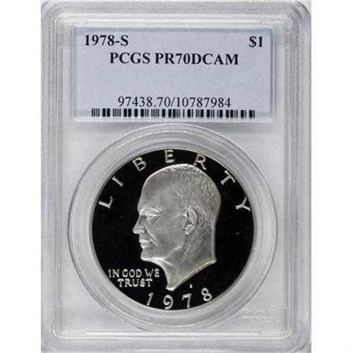 <B>1978-S $1 PR70 Deep Cameo PCGS.</B></I> Frosty devices are surrounded by deeply mirrored fields to create this perfect proof 1978-S Eisenhower dollar. The devices, especially on the reverse, exhibit subtle champagne toning over light nickel-gray. Population: 20 in 70 Deep Cameo, 0 finer (3/08).<BR><BR><b>Shipping:</b> Coins & Currency (<a target="_blank" href="http://www.heritageauctions.com/common/shipping.php">view shipping information</a>)
