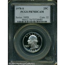 1978-S 25C PR70 Deep Cameo PCGS. An outstanding sp <B>1978-S 25C PR70 Deep Cameo PCGS.</B></I> An outstanding specimen, sharply impressed in every detail, and mark-free as well. The beautifully pristine and richly frosted devices seem to be suspended above jet-black fields. A seemingly unimprovable example. Population: 54 in PR70 Deep Cameo (11/04). <BR><BR><B>Important notice:</B> Heritage usually auctions material at the rate of 200-250 lots per hour. On some occasions eBay Live bid software or the Internet may not be able to keep up with the pace of the auction. We recommend placing a realistic absentee bid now as insurance to avoid disappointment. Occasionally the auctioneer may eliminate or reject an eBay Live bid, and the auctioneer may also reopen a lot after the close of the eBay live bidding (usually because we missed an audience bid), and may reject your bid even if it shows you as the winning bidder. By bidding via eBay Live, you agree that Heritage may award the lot to another bidder at its sole discretion under the circumstances described above or any other reasonable circumstances. Since eBay bids are not shown to us until we open the lot on the floor, we treat those bids just like floor bids. In most cases the floor responds before the eBay bid is presented to us, due to Internet lag time, so for consistency we have made it a policy that floor bids are always considered first over tie eBay live bids. Also please note that all Heritage lots purchased through eBay Live carry a 20% Buyer's Premium. Please make sure you read the Terms and Conditions before you bid. This lot is being auctioned in conjunction with a live floor auction by Heritage Galleries & Auctioneers. All final auction and invoice information will be supplied by Heritage Galleries & Auctioneers, and all other information should be considered preliminary. Lot:6018