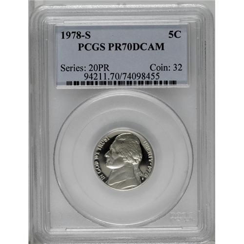 <B>1978-S<5C> PR70 Deep Cameo PCGS.</B></I> Heavily frosted, exquisitely struck devices appear to float over deep watery fields. The surfaces are marvelously pristine. A small piece of hair appears to be entrapped in the upper right reverse quadrant near the rim. <BR><BR><B>Important notice:</B> Heritage usually auctions material at the rate of 200-250 lots per hour. On some occasions eBay Live bid software or the Internet may not be able to keep up with the pace of the auction. We recommend placing a realistic absentee bid now as insurance to avoid disappointment. Occasionally the auctioneer may eliminate or reject an eBay Live bid, and the auctioneer may also reopen a lot after the close of the eBay live bidding (usually because we missed an audience bid), and may reject your bid even if it shows you as the winning bidder. By bidding via eBay Live, you agree that Heritage may award the lot to another bidder at its sole discretion under the circumstances described above or any other reasonable circumstances. Since eBay bids are not shown to us until we open the lot on the floor, we treat those bids just like floor bids. In most cases the floor responds before the eBay bid is presented to us, due to Internet lag time, so for consistency we have made it a policy that floor bids are always considered first over tie eBay live bids. Also please note that all Heritage lots purchased through eBay Live carry a 20% Buyer's Premium. Please make sure you read the Terms and Conditions before you bid. This lot is being auctioned in conjunction with a live floor auction by Heritage Galleries & Auctioneers. All final auction and invoice information will be supplied by Heritage Galleries & Auctioneers, and all other information should be considered preliminary. Lot:1184 <BR><BR><B>Winning Notification and Billing:</B> After the FINAL session in this auction is complete, Heritage will send e-mail and snail mail invoices. This process normally takes several days. All final auction and invoice information will be supplied by Heritage Galleries & Auctioneers, and all other information should be considered preliminary. <BR><BR>This auction will be conducted on a live auction floor and over the Internet through eBay Live. If you choose to place an absentee bid, please take a moment to <font color='#0000ff'><u><a href='http://pages.ebay.com/liveauctions/help/before/laabsentee.html'>learn how eBay Live absentee bidding works</a></u></font><font color='#000000'>