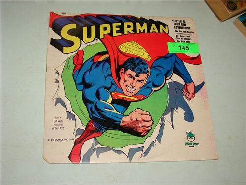 PETER PAN PRODUCTIONS, SUPERMAN #8211 RECORD ALBUM. "LISTEN TO FOUR NEW ADVENTURES! - THE MAN FROM KRYPTON, CITY UNDER SIEGE, STAR OF BANGALORE, AND THE KILLER BEES". AS SHOWN. VIEW PICTURE FOR DETAIL.