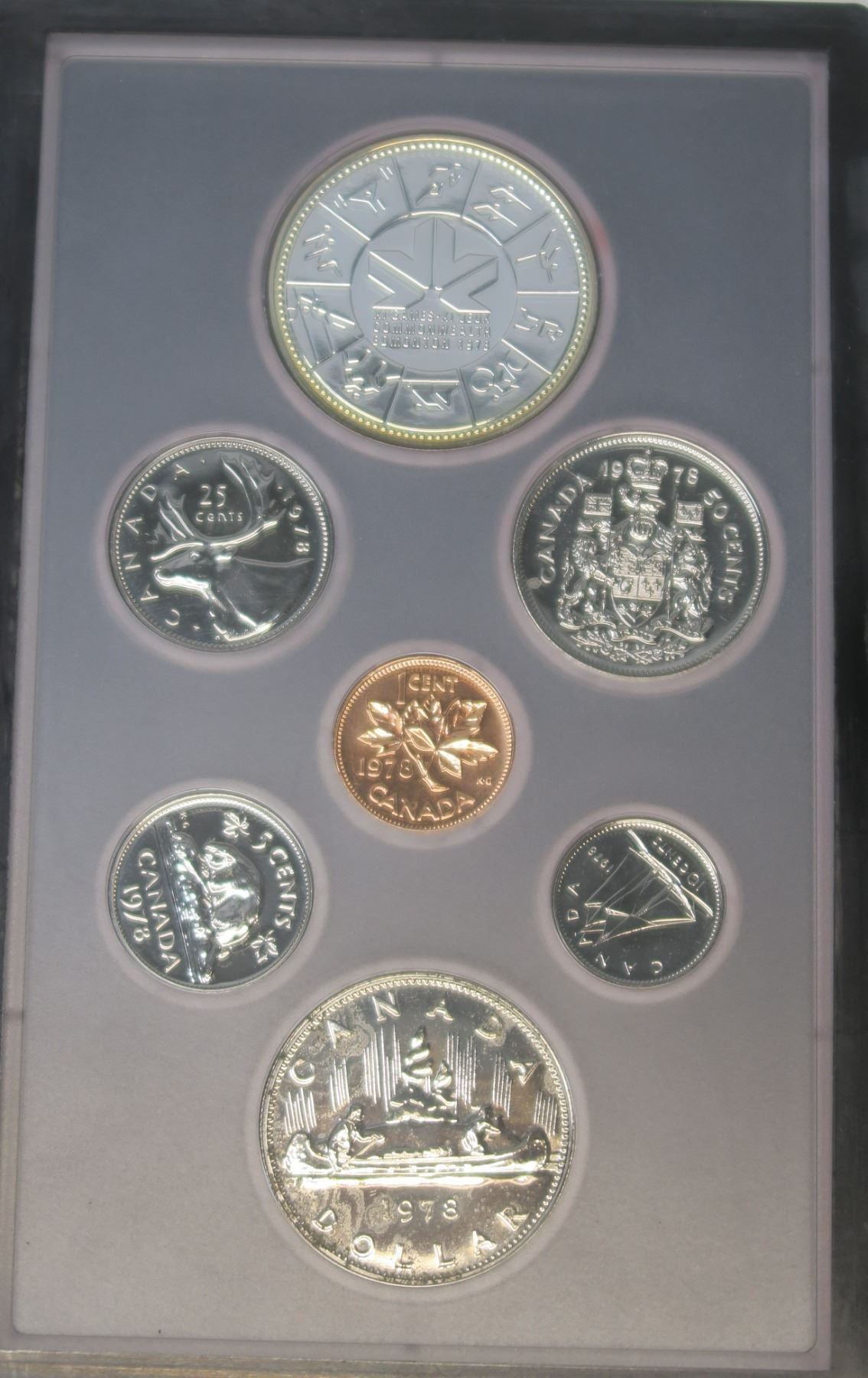 1978 Specimen Set. 7-coin set includes Silver Dollar that commemorates the Commonwealth Games. Housed in its original case of issue.