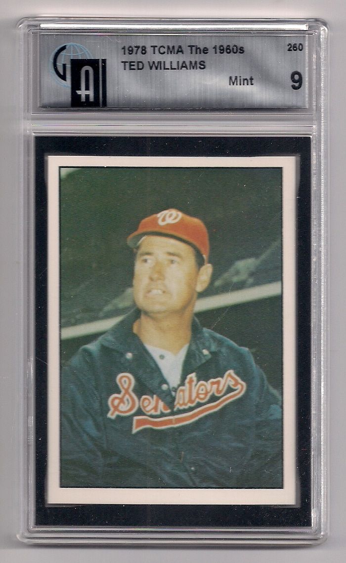 1978 TCMA The 1960's Ted Williams Card #260. This Ted Williams card has been graded Mint 9 by Global Authentication Inc. (GAI).