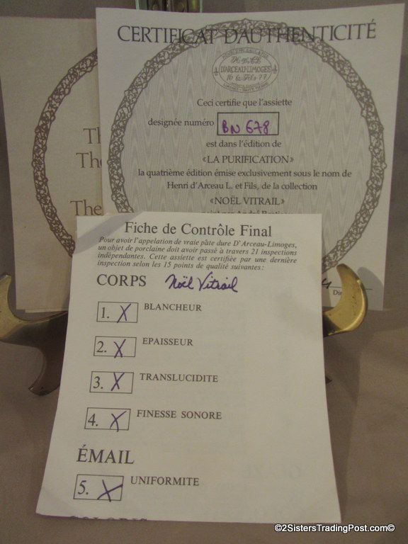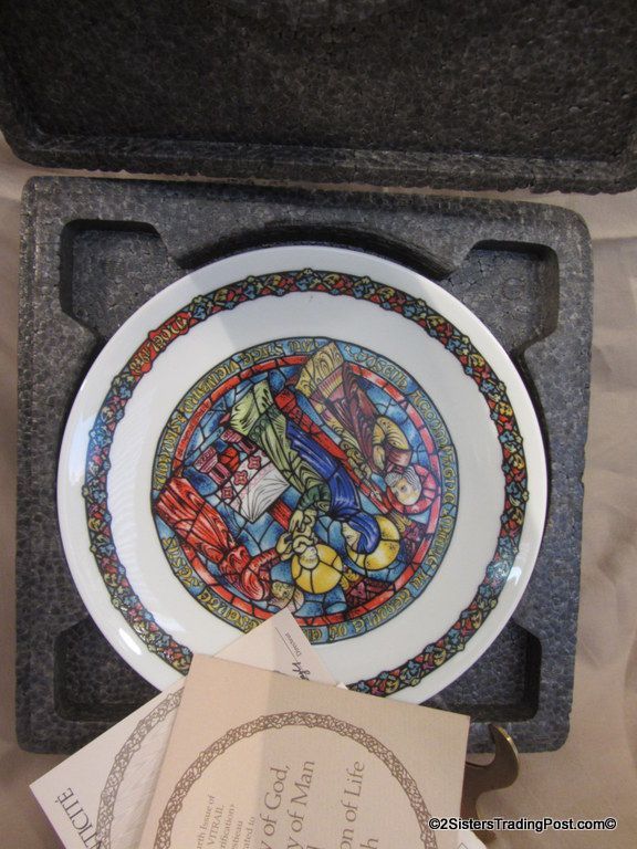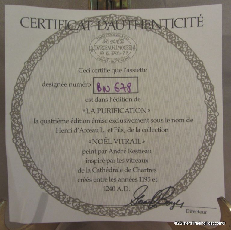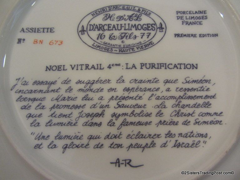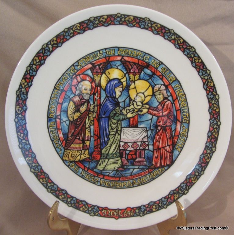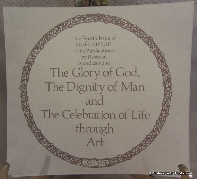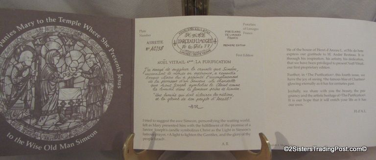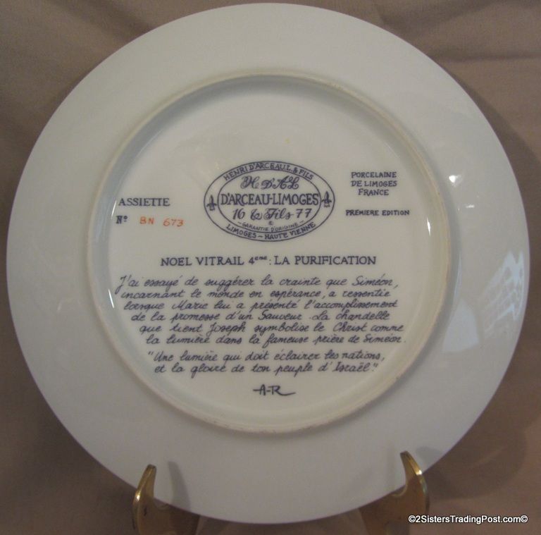8 1/2" plate, dated 1978 'The Purification' the 4th issue of Noel Vitrail *The Purification* by Restieau and is dedicated to "The Glory of God, The Dignity of Man and The Celebration of Life through Art". This is a Limoges Porcelain plate and is numbered BN 673. Comes in the original Styrofoam mailer, with paperwork and COA. (Please see images for details)