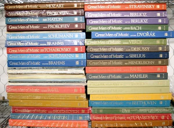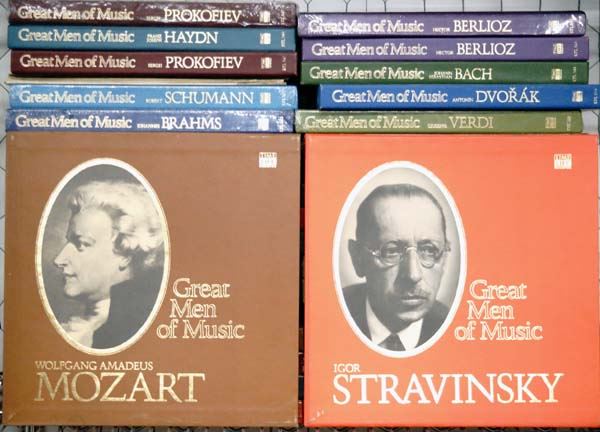1978 Time Life Great Men in Music Album Collection, Classical Music Composers, we have 21 of the 30 Boxed Sets, our collection features the following composers some of which we have doubles: Stravinsky (2), Berlioz (2), Bach (2), Dvorak, Verdi, Debussy, Sibelius, Mendelssohn, Ravel (2), Mahler, Chopin (2), Strauss, Beethoven, Tchaikovsky (2), Mozart (2), Haydn (2), Prokofiev (2), Schumann (2), Brahms (2), Schubert (2), Shostakovich, 15 of the boxed sets are still cellophane wrapped, missing from this collection is Vivaldi, Bruchner, Copeland, Liszt, Wagner, Puccini, Rachmaninoff, Bartok, and Handel