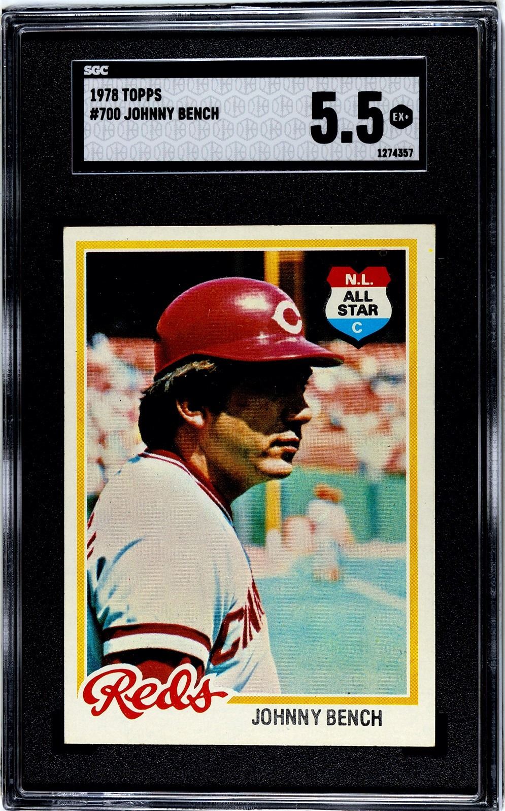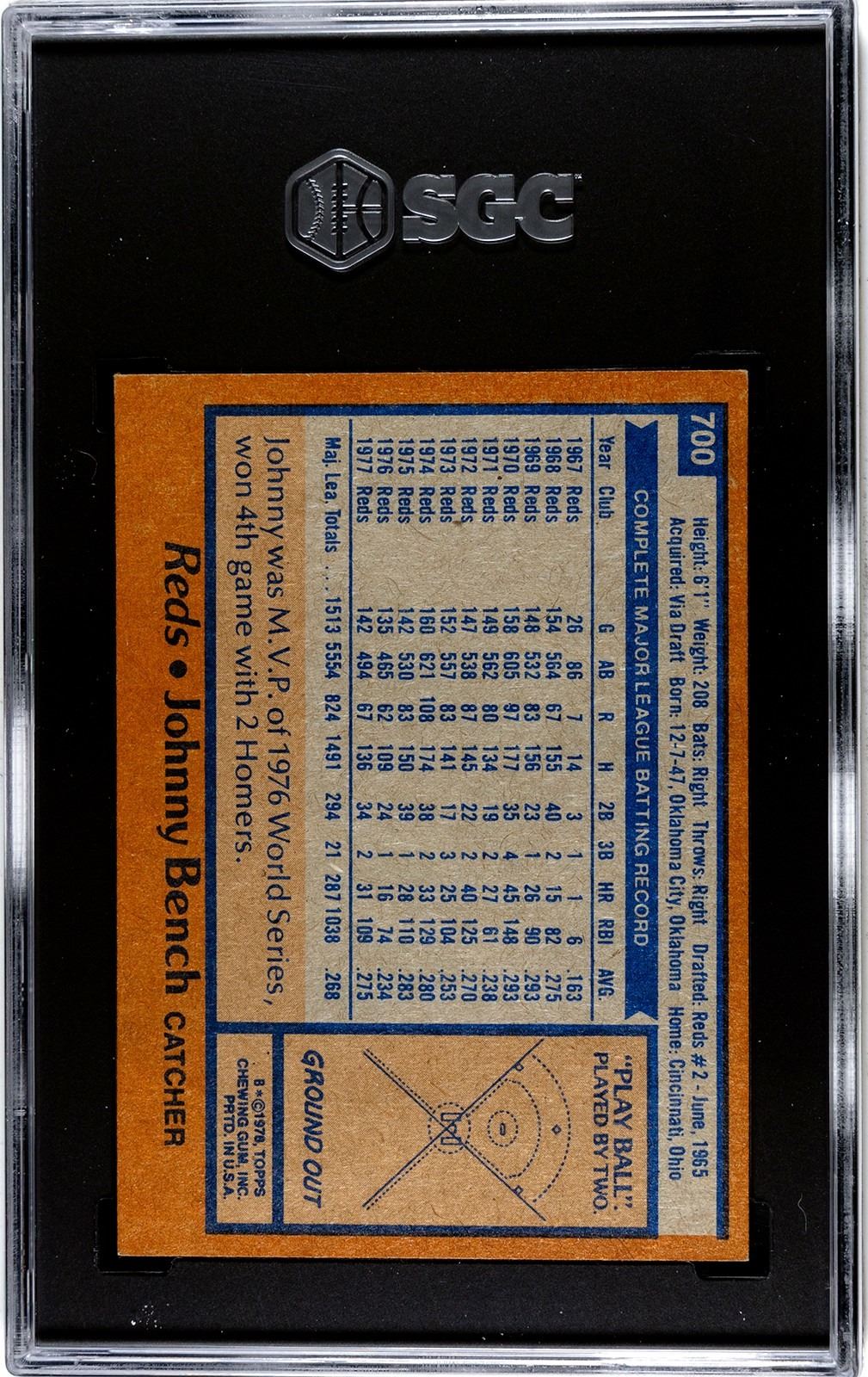 HOFer Johnny Bench is widely regarded as the greatest catcher of all time. He was a beast at the plate, leading the NL in HR twice and RBI three times, while winning Rookie of the Year and two MVPs. He was also a top tier defensive catcher, winning 10-straight Gold Glove awards. He was a main cog in the Big Red Machine, winning back-to-back World Series titles in 1975 and 1976. Graded 5.5 EX+ by SGC.