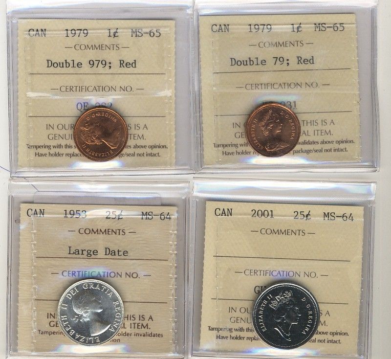 1979 1¢ Dbl 79, Dbl 979 both MS65RD, 1953 25¢ LgDt & 2001 both MS64. Lot of 4 coins.