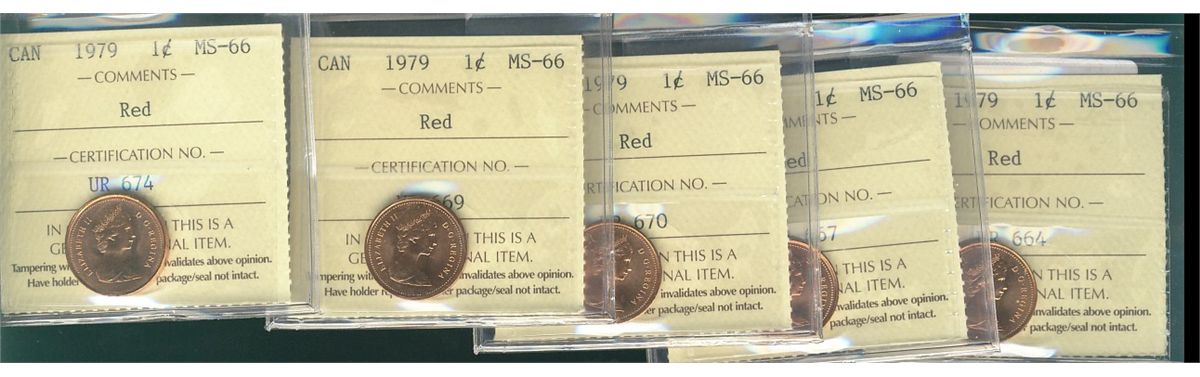 1979 1¢ ICCS MS66RD. Lot of 5 coins.