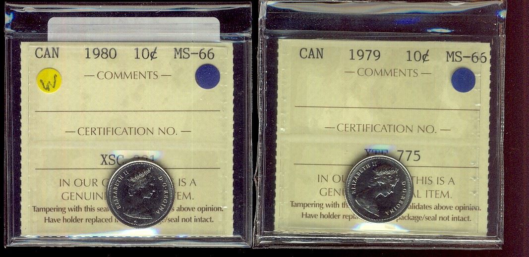 1979 10¢ &1980 ICCS MS66. Lot of 2 coins.