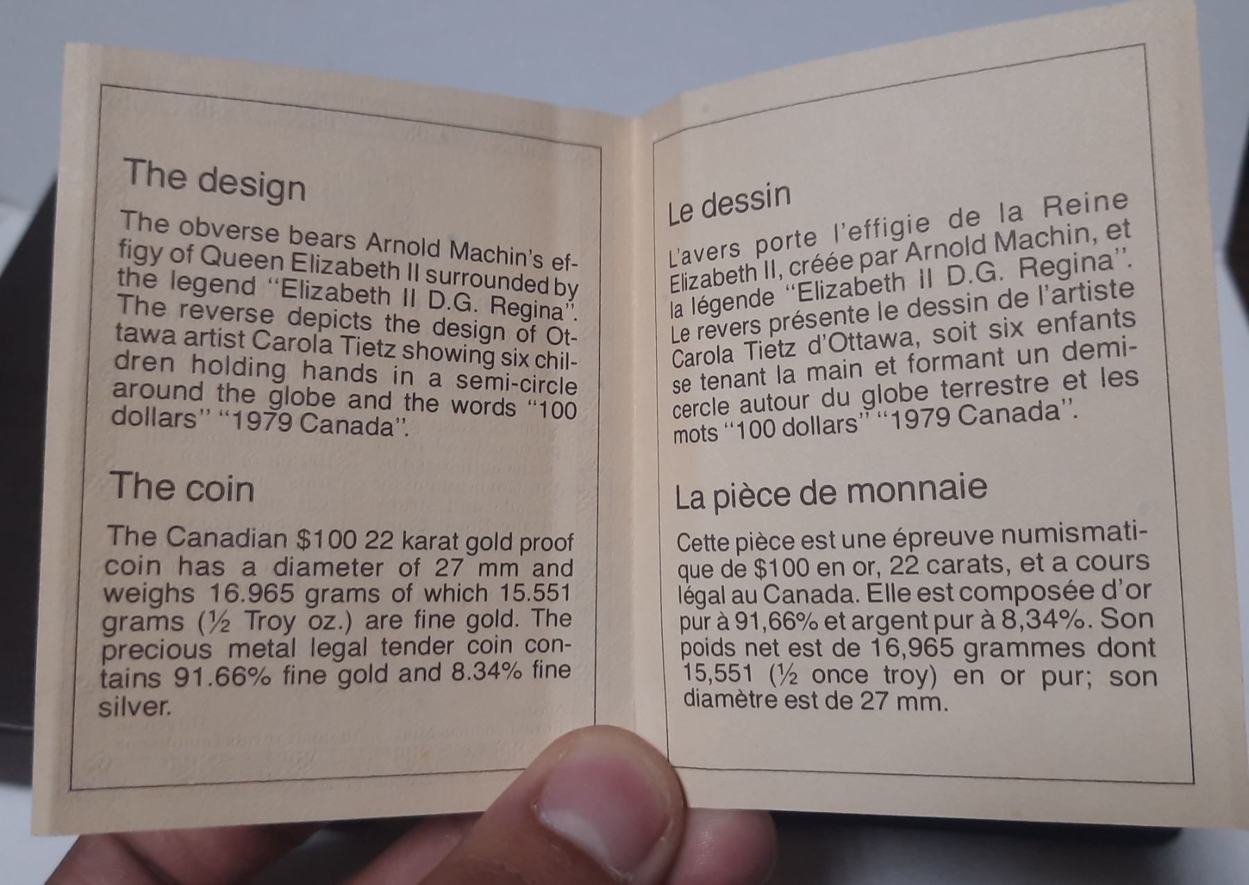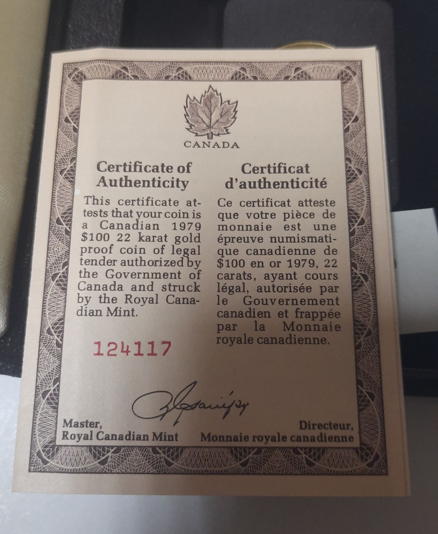 1979  $100.00, 22 Karat Gold Proof Coin. Certificate of Authenticity included.