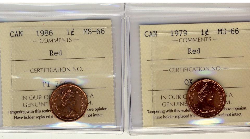 1979 & 1986 1¢ ICCS MS66. Lot of two coins both gem full red examples.