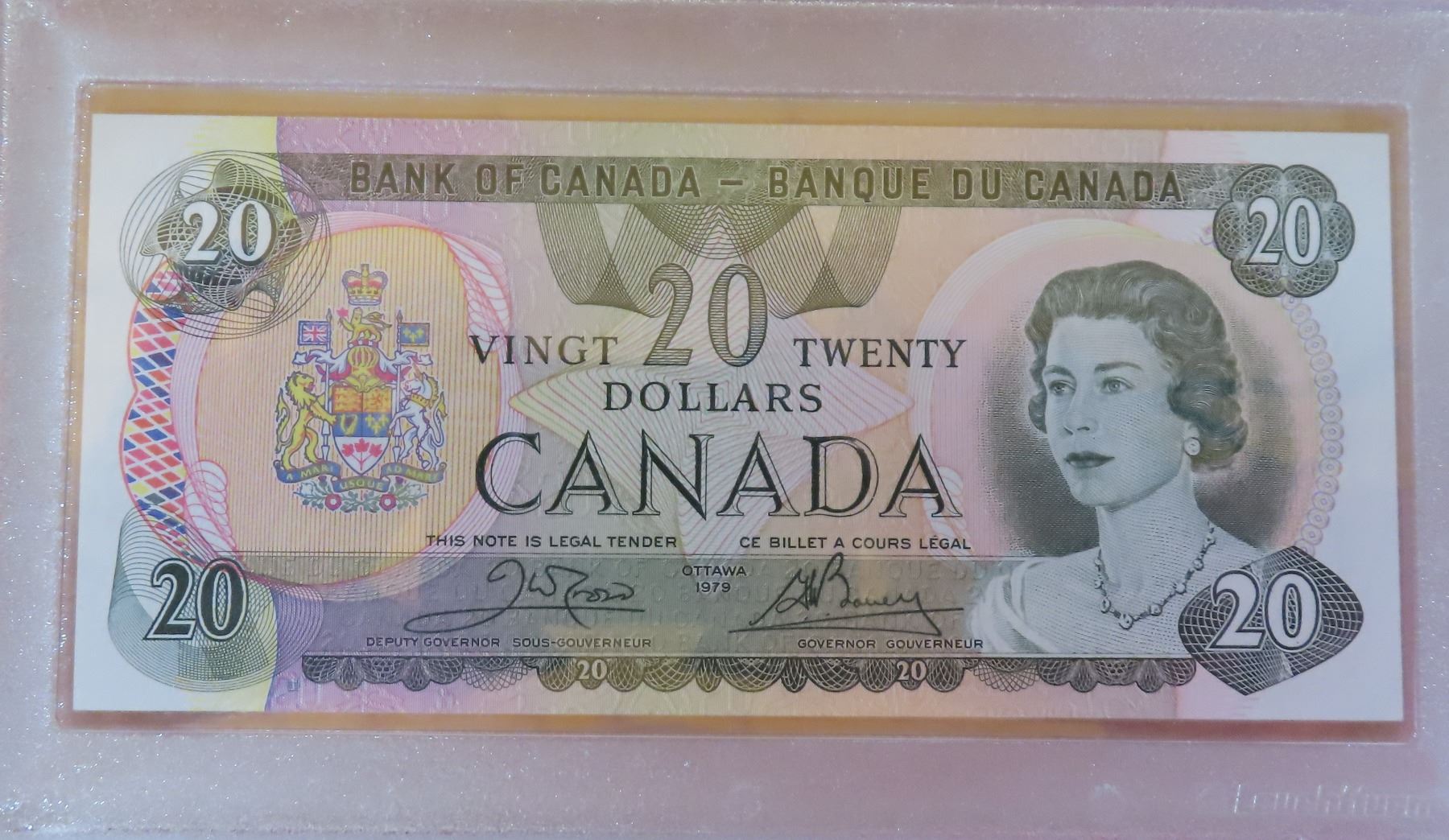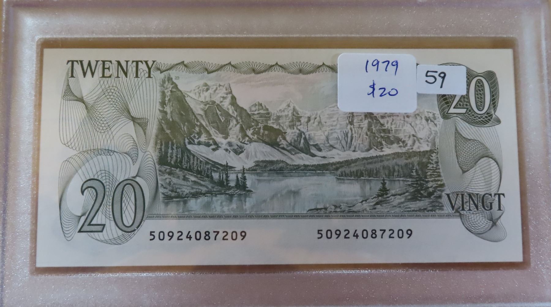 1979 $20. Crow-Bouey signatures. 509 CBN Prefix. BC-54a. Uncirculated. Housed in a hard plastic holder.