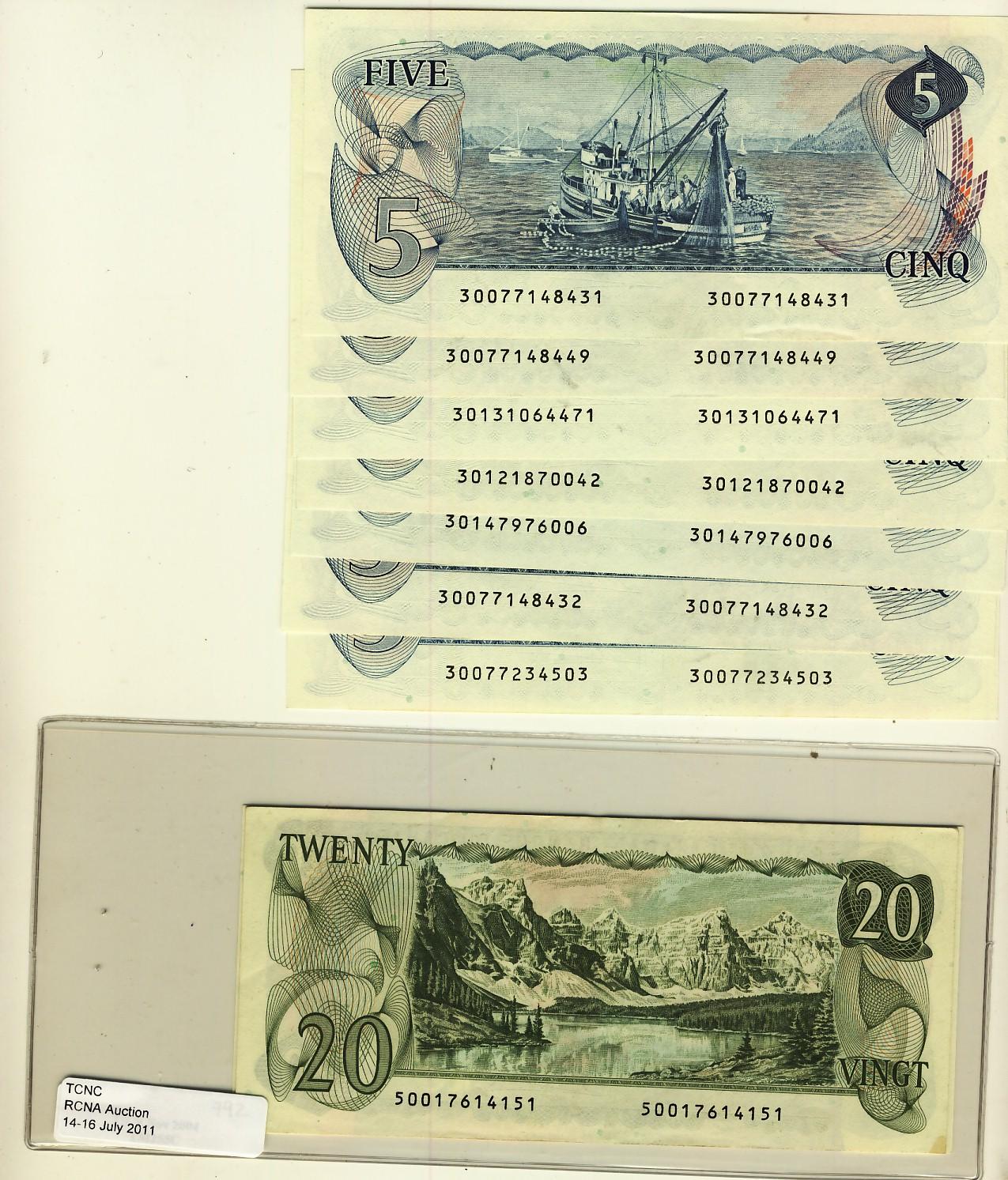 1979 $5 BC-53a(5) & $20 BC-54a (5). Lot of 10 notes all AU to crisp UNCs. Should be viewed.