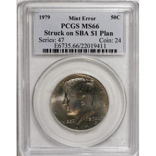 <B>1979 50C --Struck on an SBA Planchet--MS66 PCGS.</B></I> Lightly toned champagne and gold with lovely luster. The strike is generally pleasing, though the reverse peripheral elements show the spreading often evident on wrong-planchet errors. An interesting error dating to the first year of the Susan B. Anthony dollar.<BR><BR><B>Coin Engraver:</B> Gilroy Roberts and Frank Gasparro<BR><BR><b>Shipping:</b> Coins & Currency (<a target="_blank" href="http://www.heritageauctions.com/common/shipping.php">view shipping information</a>)