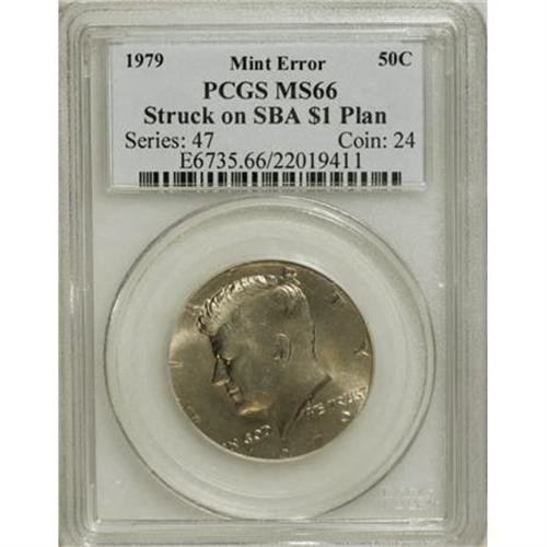 <B>1979 50C Kennedy Half--Struck on an SBA Planchet--MS66 PCGS.</B></I> Lightly toned champagne and gold with lovely luster. The strike is generally pleasing, though the reverse peripheral elements show the spreading often evident on wrong-planchet errors. An interesting error dating to the first year of the Susan B. Anthony dollar.<BR><BR><B>Coin Engraver:</B> Gilroy Roberts and Frank Gasparro<BR><BR><b>Shipping:</b> Coins & Currency (<a target="_blank" href="http://www.heritageauctions.com/common/shipping.php">view shipping information</a>)