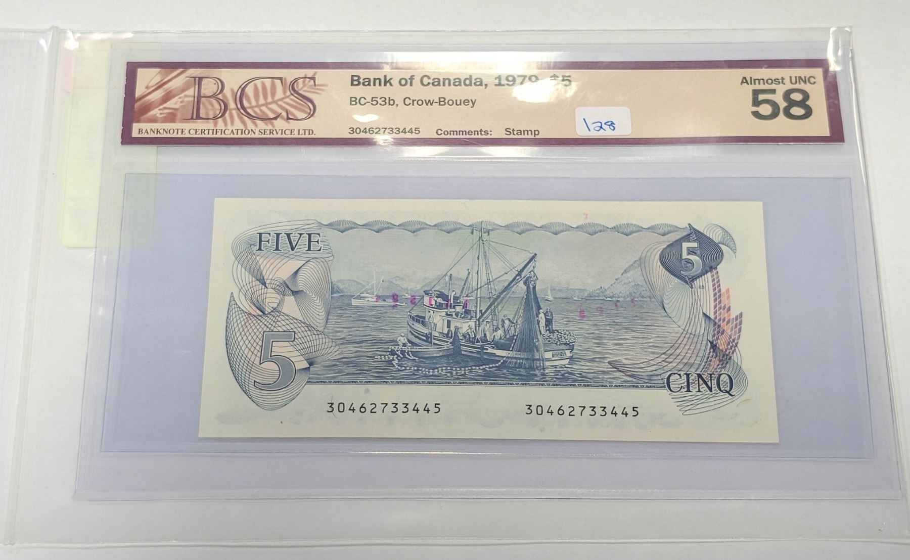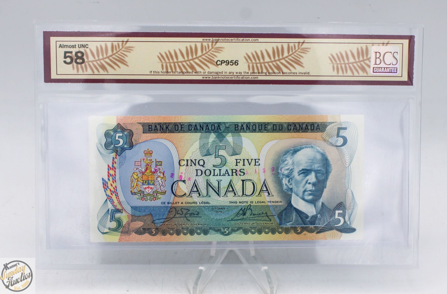 1979 CANADIAN $5 BILL GRADED 58 ALMOST UNGRADED