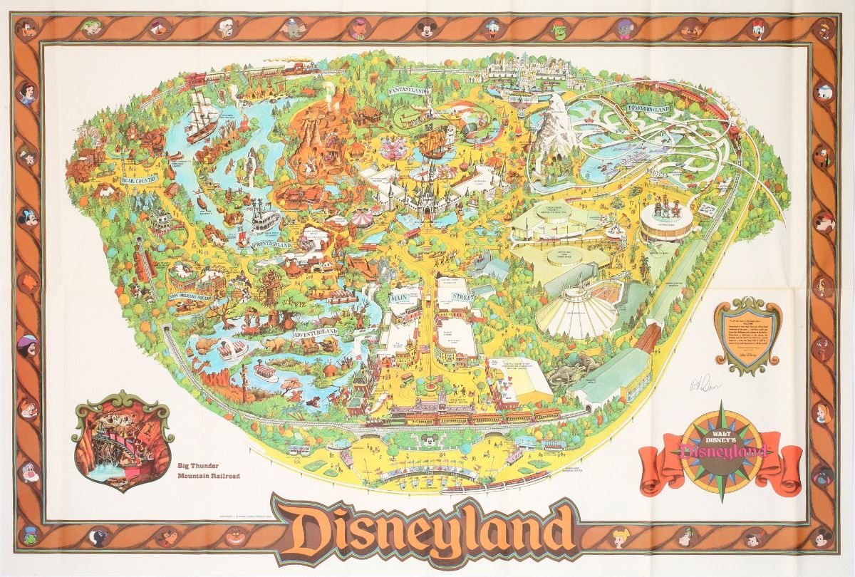 (Disneyland, 1979) The second map in the third series of Disneyland park maps. This 1979 version features the first appearance of the "Big Thunder Mountain Railroad" attraction. Signed in the bottom right by legendary Disney Imagineer Bob Gurr. Stored folded, as originally sold. Measures 29.5"x44". In very good condition.