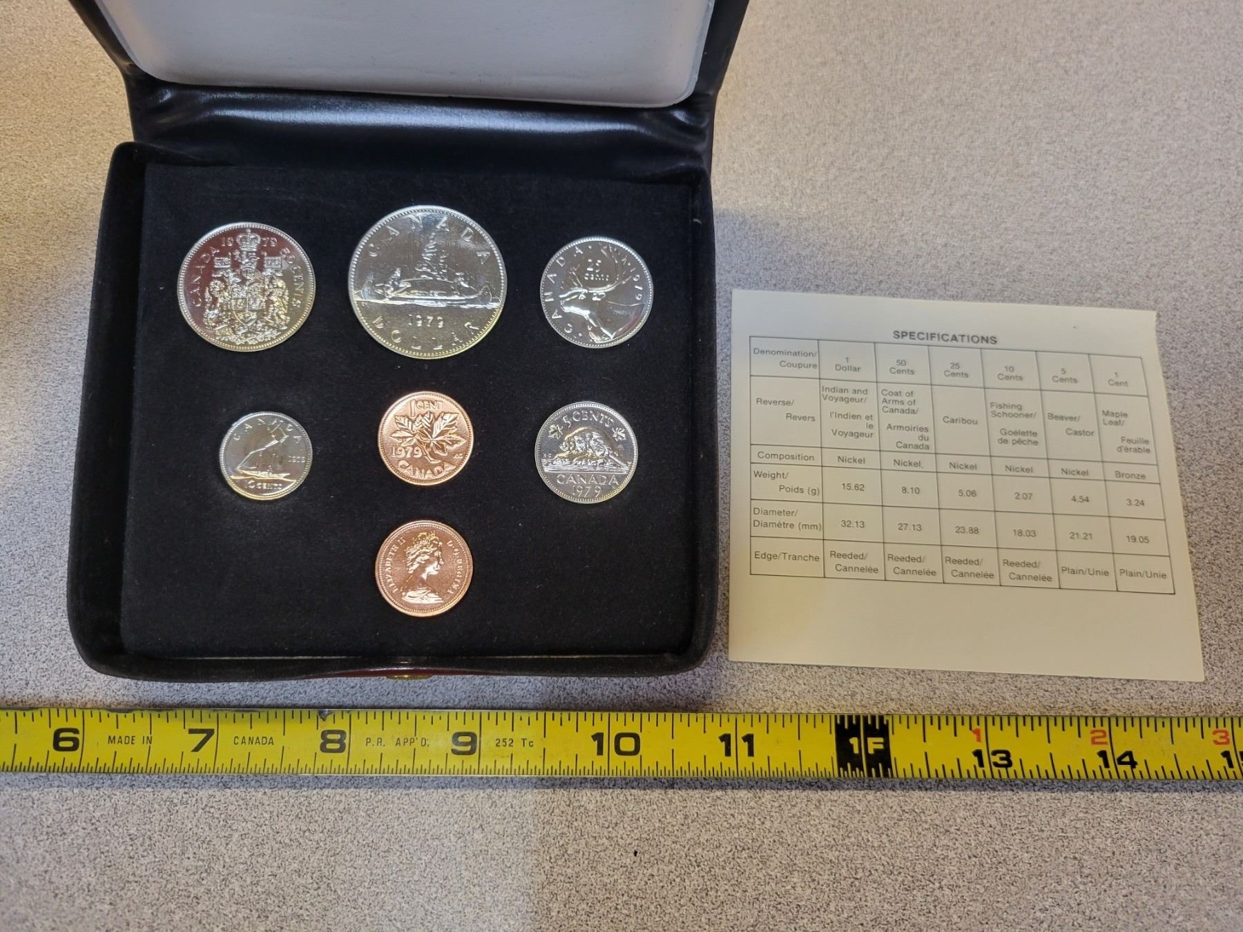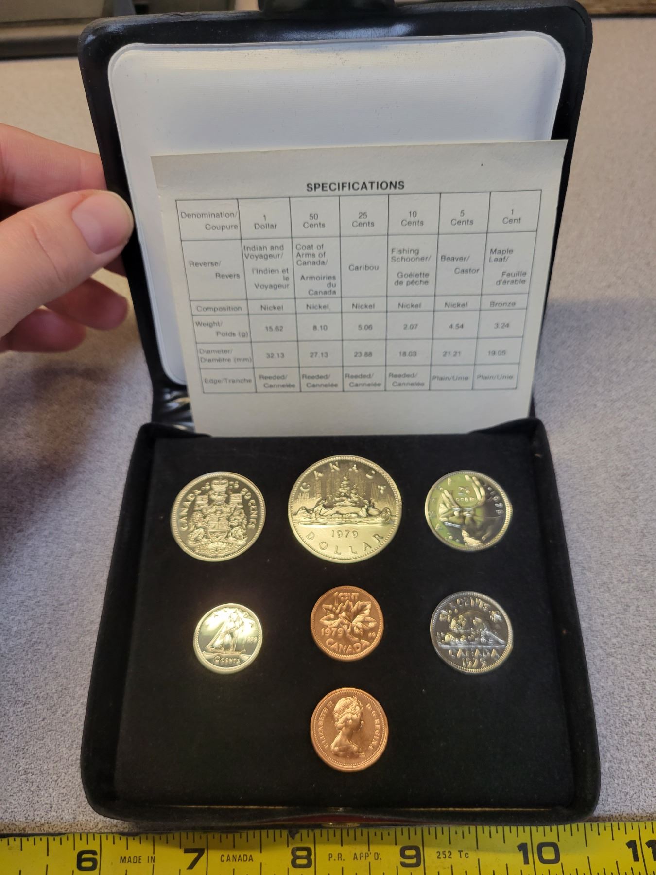 1979 Double Cent Specimen 7-coin Set. Housed in its original case of issue with Maple Leaf stamped in Gold.