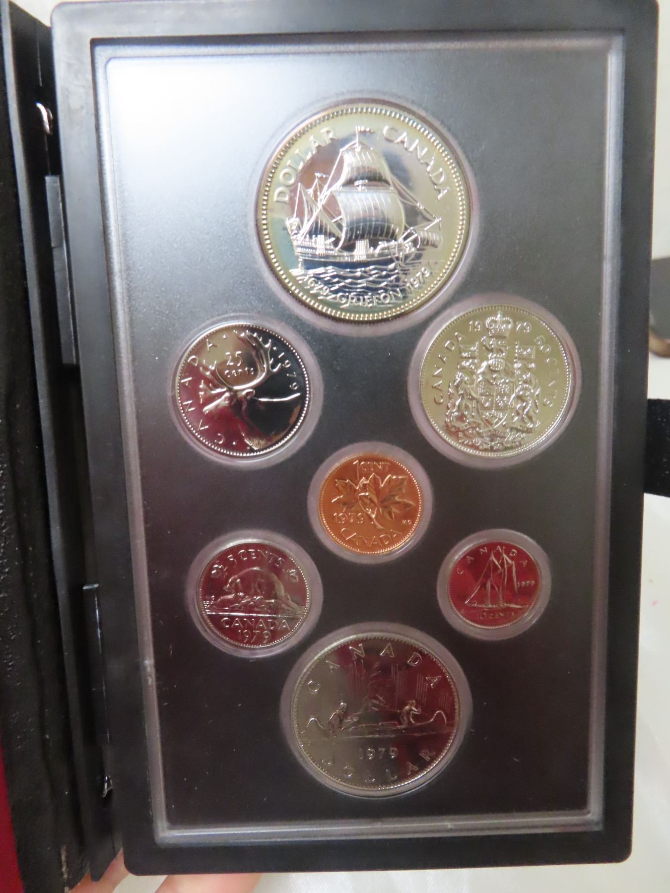 1979 Double Dollar Prestige Set. Silver Dollar marks the 300th Anniversary of the first sailing of the Griffon. 7-coin Specimen Set. Housed in its original Royal Canadian Mint case of issue. Includes Certificate of Authenticity.