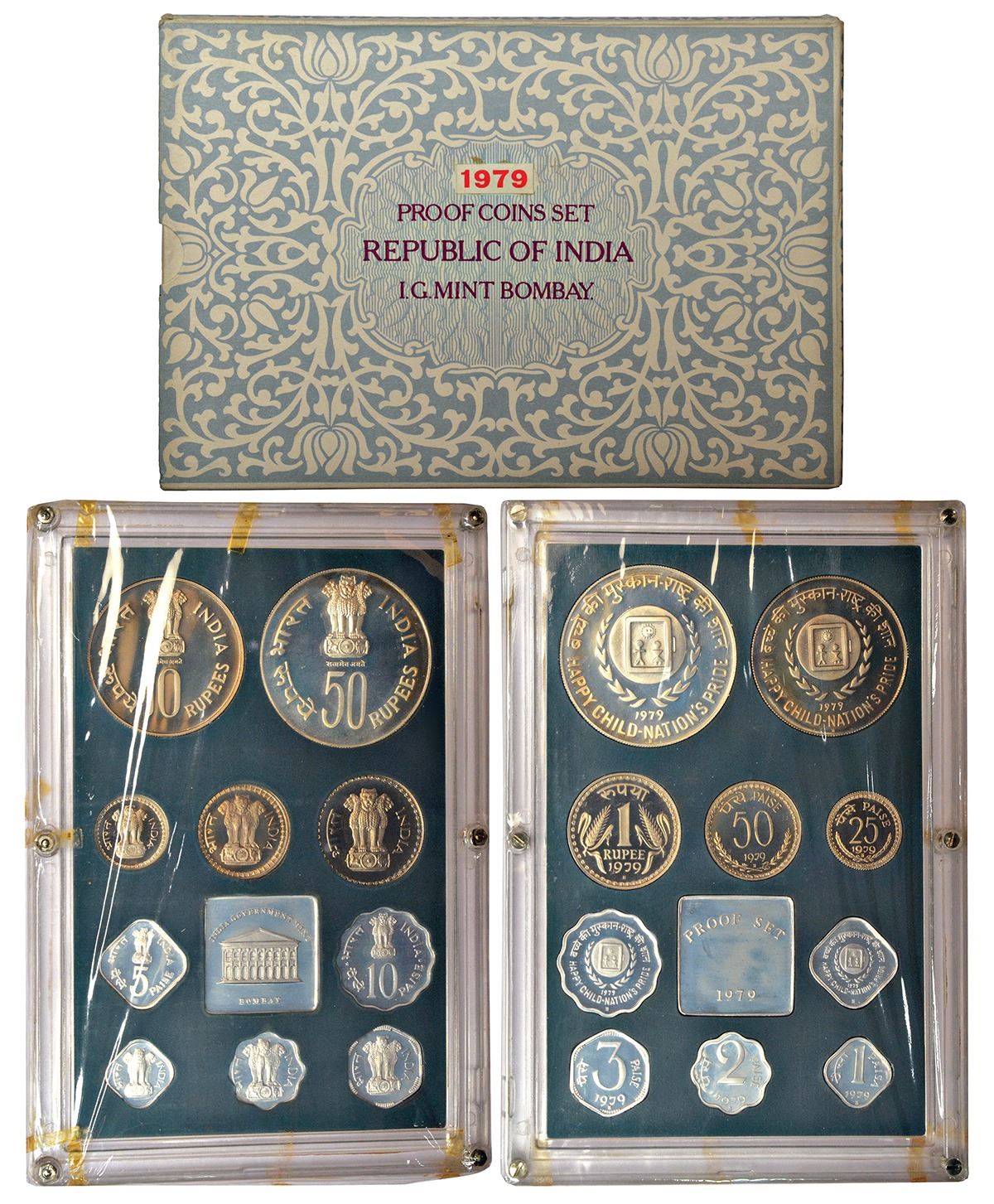1979, Happy Child Nation's Pride, Proof set of 10 coins, 50 rupees, 10 rupees, 1 rupee, 50 paise, 25 paise, 10 paise, 5 paise, 3 paise, 2 paise and 1 paisa, Bombay mint, RB 71, in original mint packing, weather effect on 50 rupees coin.