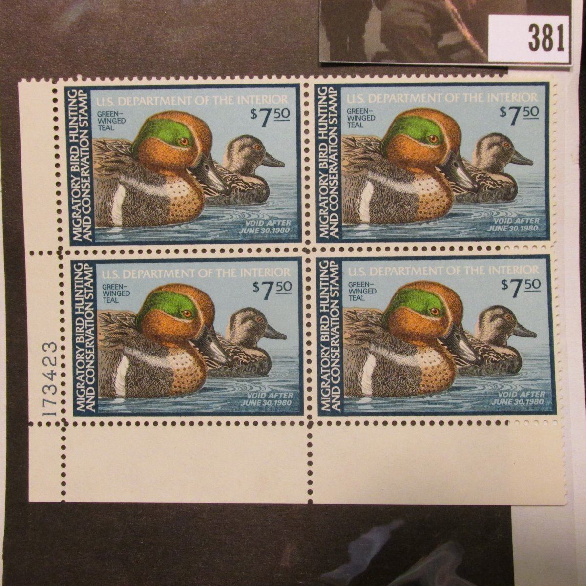 1979 Line numbered Plateblock of four RW46 Federal Migratory Waterfowl $7.50 Stamps. Mint condition.