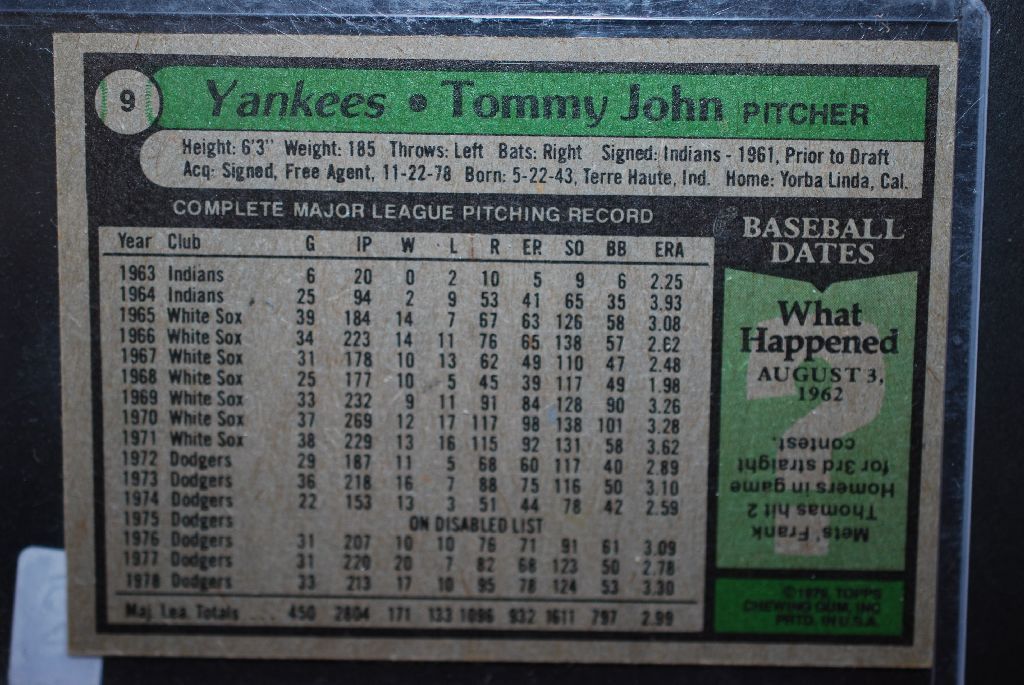 1979 MLB Tommy John New York Yankees Baseball Trading Card; EST. $5-10