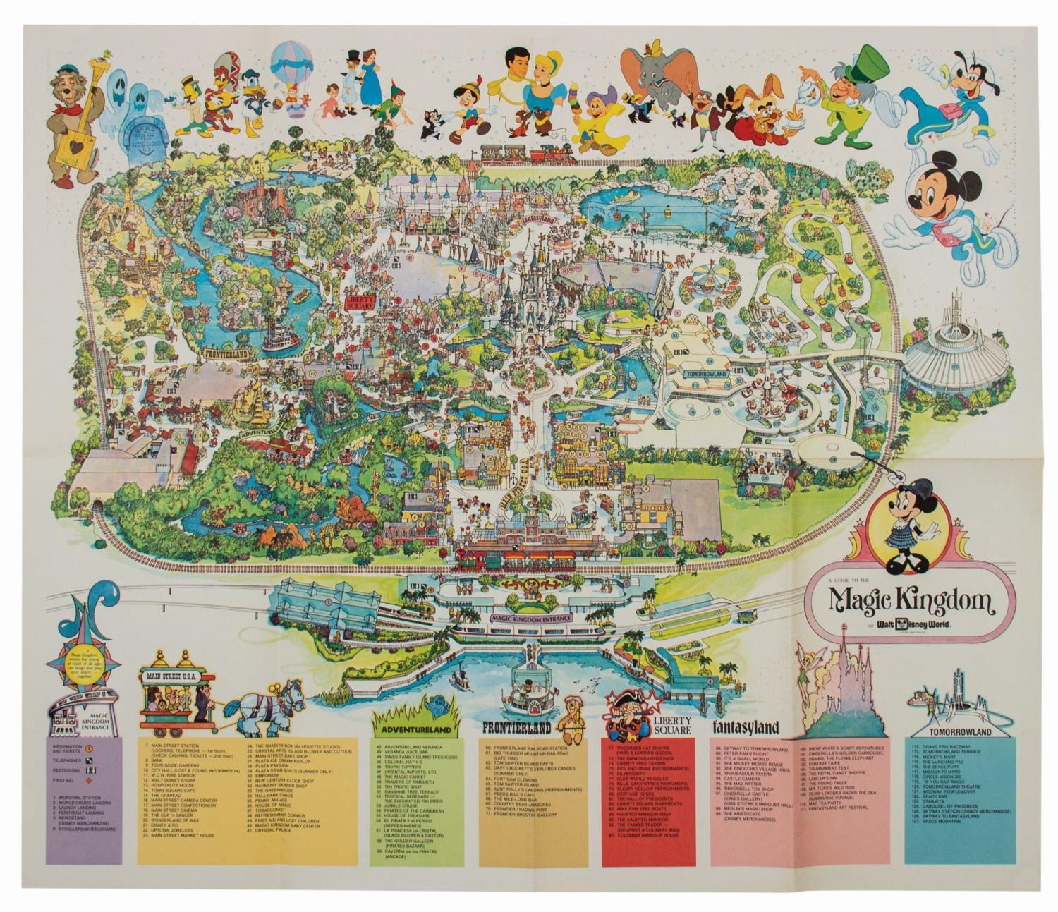 (Walt Disney World, 1979) An illustrated souvenir map of Walt Disney World's Magic Kingdom released in 1979. The colorful map provides a whimsical snapshot of the attractions and amenities available to guests during the park's first decade of operation. Folded as issued, the map measures 31.5"x38" and is in very good condition with corner tip bends, cross fold wear, faint tan toning along the central horizontal fold at far right and at lower right, and some stress lines, most apparent along the top half of the rightmost vertical fold.