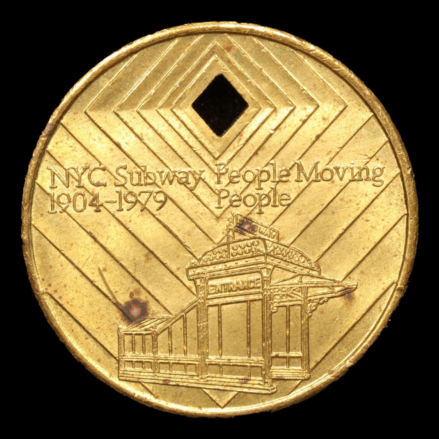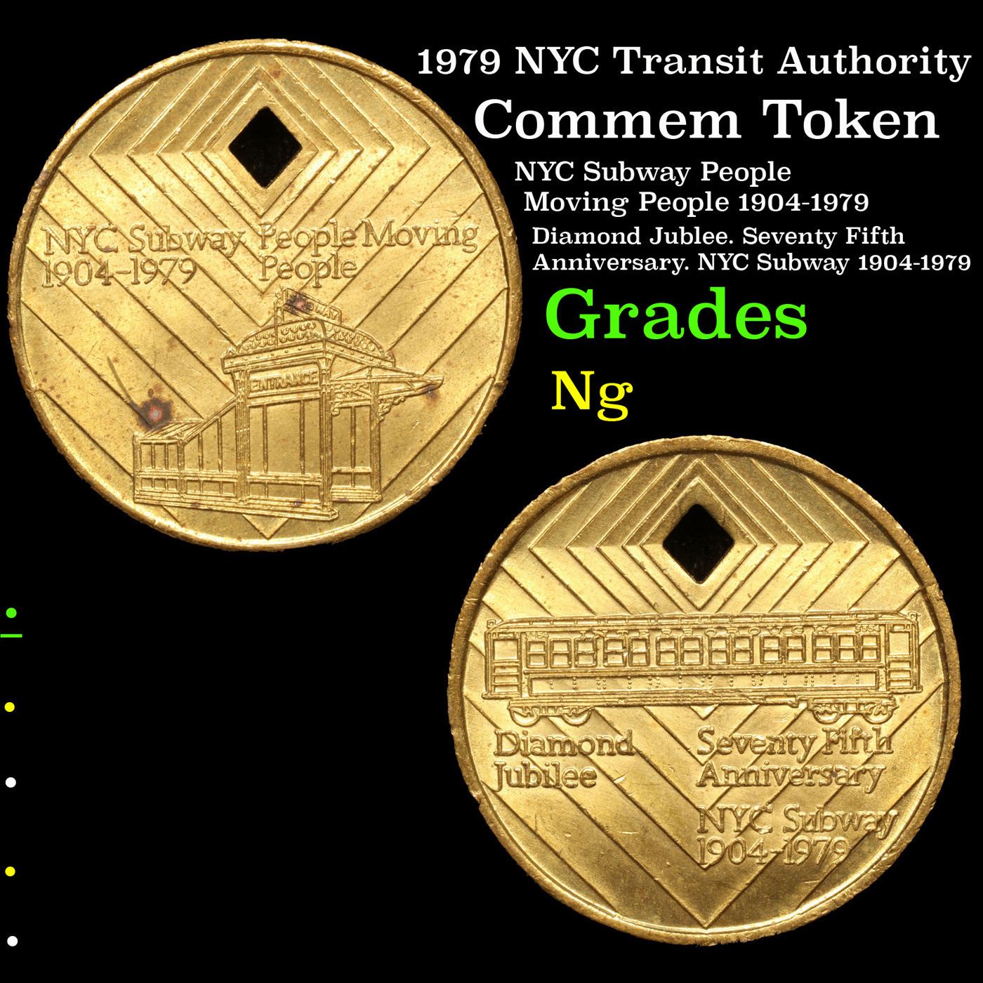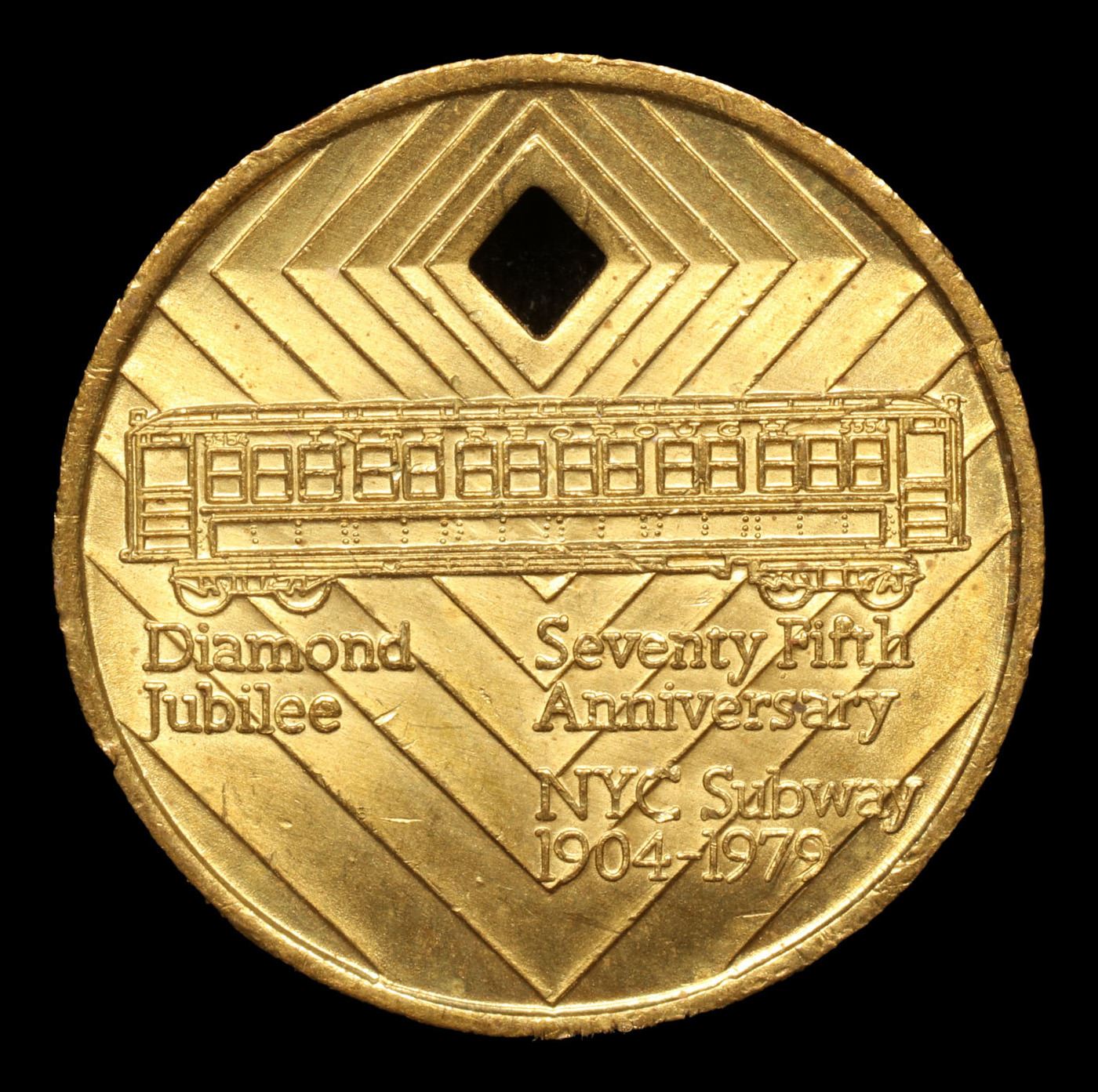1979 NYC Transit Authority Grades NG. This auction is for 1 vintage New York City Subway tokens. They are the DIAMOND JUBILEE NEW YORK CITY TOKENS from 1979. On one side are a subway car and NYC Subway 1904-1979. It also says Seventy Fifth Anniversary Diamond Jubilee. On the other side is a picture of the entrance to the subway and the words People Moving People. It has a diamond cutout along with diamond patterns on the token.