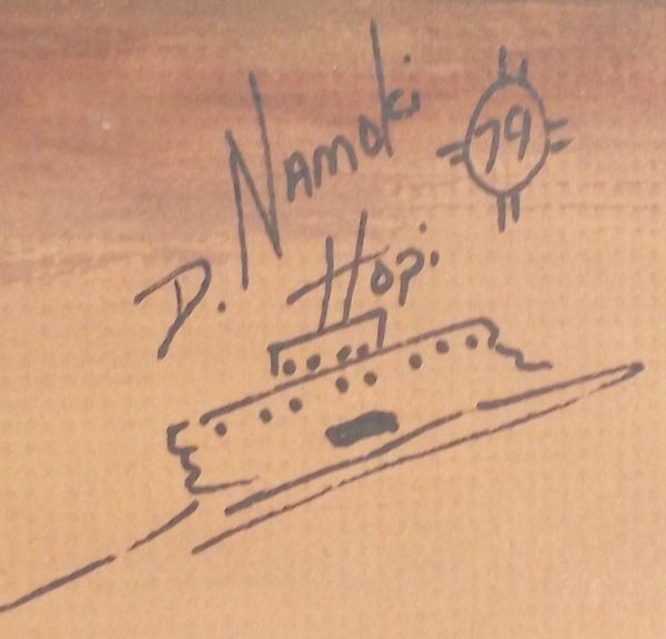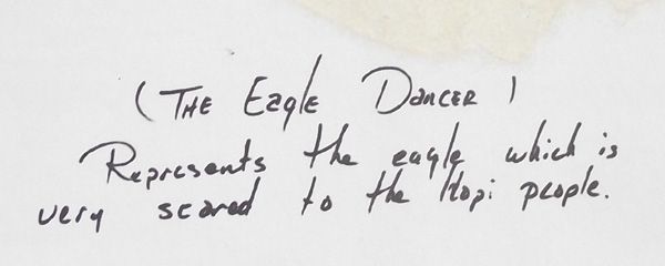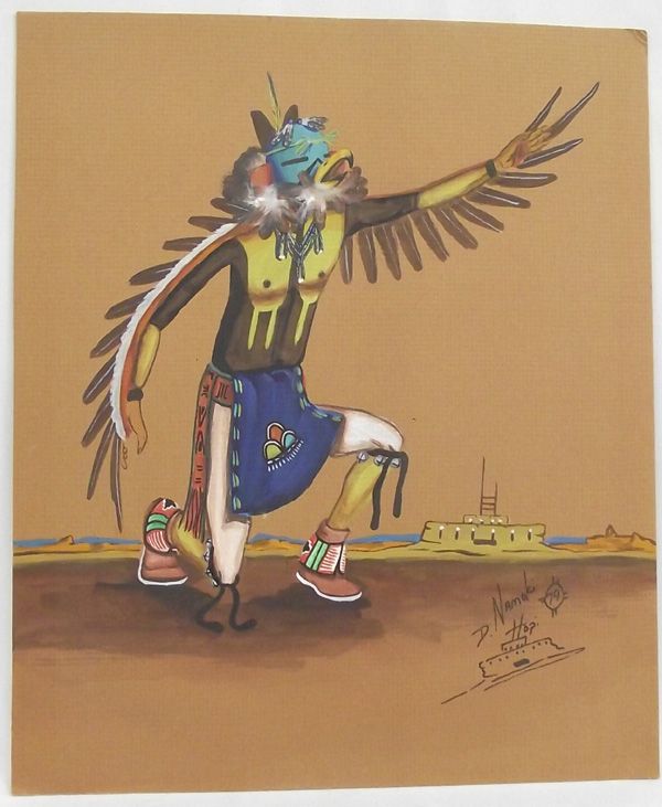 1979 Original Painting Eagle Dancer- Daniel Namoki. Original artwork by noted Native American Hopi artist, Daniel Namoki. On board, signed and dated in lower right corner, it measures 14''H x 12''W. As noted in handwriting on the back, the Eagle Dancer represents the eagle which is very sacred to the Hopi people.