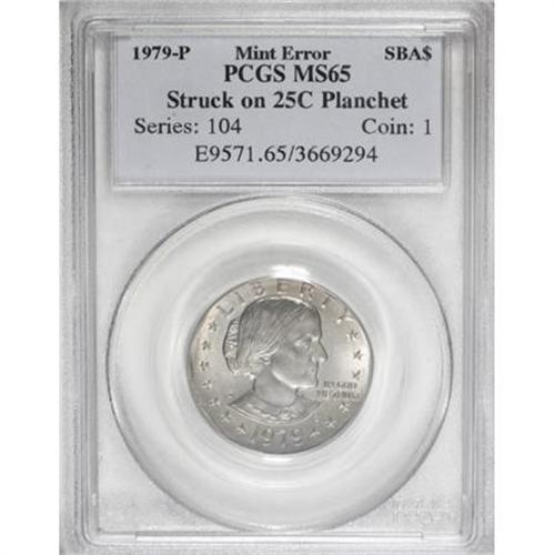 <B>1979-P SBA$ --Struck on a Quarter Planchet--MS65 PCGS.</B></I> While none of the major design elements are missing, the distinctive 11-sided inner rim is absent due to the smaller planchet. Light green-gold tints appear on each side of this error, which amusingly illustrates contemporary complaints about how hard it was to distinguish the mini-dollar and the quarter.<BR><BR><b>Shipping:</b> Coins & Currency (<a target="_blank" href="http://www.heritageauctions.com/common/shipping.php">view shipping information</a>)