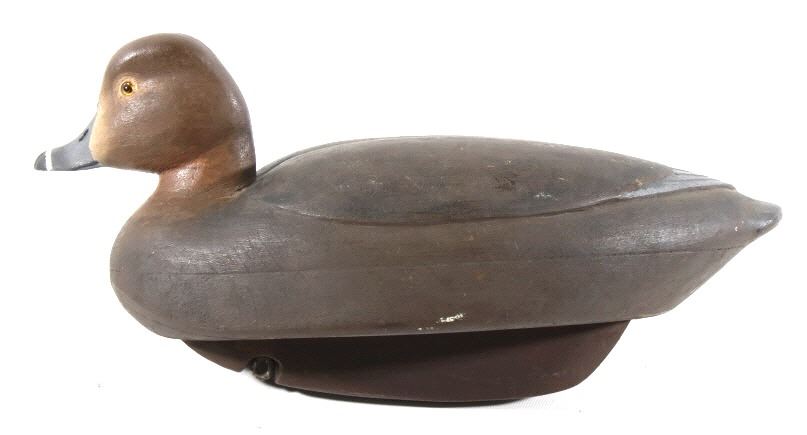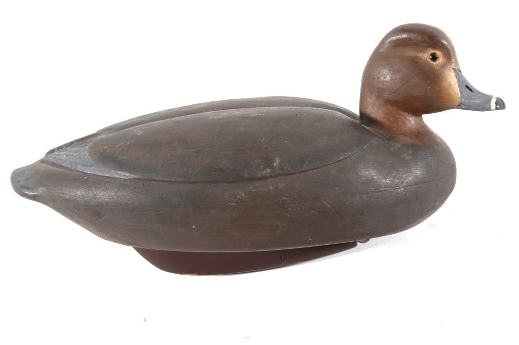 For your bidding pleasure is this 1979 Redhead Decoy by Jim Mensing. The duck shows well crafted design with very detail oriented carving and make. With realistic shading to body, wings, and decoration to the head; this duck is shown with texture to the wings and head consistent with life-like features. Redheads breed in the northern prairies of the United States and Canada and the intermountain marshes of the west. They prefer non-forested environments with water areas sufficiently deep to provide permanent and fairly dense emergent vegetation for nesting. This decoy has a tag that states when the decoy was sold and what that date was; 12/25/79. The measurements of this duck are 15" long 7" x 6"