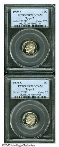 <B>1979-S<10C> Type One PR70 Deep Cameo PCGS,</B></I> a magnificent white on black specimen; and a <B>1979-S Type Two PR70 Deep Cameo PCGS,</B></I> clear S mintmark, a hint of gold color.<BR><I>From The Western Hills Collection.</B></I>