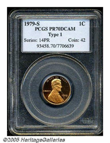 <B>1979-S<1C> Type One PR70 Deep Cameo PCGS.</B></I> The Type One coins display a partially filled S mintmark. This Registry Set quality piece has perfectly preserved surfaces that display deep cameo contrast on each side and rich, full red mint color. Population: 10 in 70 (6/05).<BR><I>From The William Bickel Collection, Part One.</B></I>
