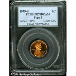 1979-S 1C Type Two PR70 Deep Cameo PCGS. A spectac <B>1979-S 1C Type Two PR70 Deep Cameo PCGS.</B></I> A spectacular orange-red specimen with radiant devices and seamless reflective fields. A perfect carbon-free example of the 'Clear S' subtype. Population: 23 in 70, 0 finer (10/04). <BR><BR><B>Important notice:</B> Heritage usually auctions material at the rate of 200-250 lots per hour. On some occasions eBay Live bid software or the Internet may not be able to keep up with the pace of the auction. We recommend placing a realistic absentee bid now as insurance to avoid disappointment. Occasionally the auctioneer may eliminate or reject an eBay Live bid, and the auctioneer may also reopen a lot after the close of the eBay live bidding (usually because we missed an audience bid), and may reject your bid even if it shows you as the winning bidder. By bidding via eBay Live, you agree that Heritage may award the lot to another bidder at its sole discretion under the circumstances described above or any other reasonable circumstances. Since eBay bids are not shown to us until we open the lot on the floor, we treat those bids just like floor bids. In most cases the floor responds before the eBay bid is presented to us, due to Internet lag time, so for consistency we have made it a policy that floor bids are always considered first over tie eBay live bids. Also please note that all Heritage lots purchased through eBay Live carry a 20% Buyer's Premium. Please make sure you read the Terms and Conditions before you bid. This lot is being auctioned in conjunction with a live floor auction by Heritage Galleries & Auctioneers. All final auction and invoice information will be supplied by Heritage Galleries & Auctioneers, and all other information should be considered preliminary. Lot:5445