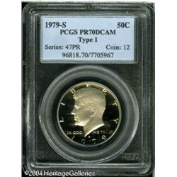 1979-S 50C Type One PR70 Deep Cameo PCGS. The snow <B>1979-S 50C Type One PR70 Deep Cameo PCGS.</B></I> The snow-white devices demonstrate superior contrast with the immaculate darkly mirrored fields. Unlike the 1981-S varieties, the 1979-S "Filled S" mintmark is easily distinguished from the Type Two variety. Population: 75 in 70 (10/04). <BR><BR><B>Important notice:</B> Heritage usually auctions material at the rate of 200-250 lots per hour. On some occasions eBay Live bid software or the Internet may not be able to keep up with the pace of the auction. We recommend placing a realistic absentee bid now as insurance to avoid disappointment. Occasionally the auctioneer may eliminate or reject an eBay Live bid, and the auctioneer may also reopen a lot after the close of the eBay live bidding (usually because we missed an audience bid), and may reject your bid even if it shows you as the winning bidder. By bidding via eBay Live, you agree that Heritage may award the lot to another bidder at its sole discretion under the circumstances described above or any other reasonable circumstances. Since eBay bids are not shown to us until we open the lot on the floor, we treat those bids just like floor bids. In most cases the floor responds before the eBay bid is presented to us, due to Internet lag time, so for consistency we have made it a policy that floor bids are always considered first over tie eBay live bids. Also please note that all Heritage lots purchased through eBay Live carry a 20% Buyer's Premium. Please make sure you read the Terms and Conditions before you bid. This lot is being auctioned in conjunction with a live floor auction by Heritage Galleries & Auctioneers. All final auction and invoice information will be supplied by Heritage Galleries & Auctioneers, and all other information should be considered preliminary. Lot:6339