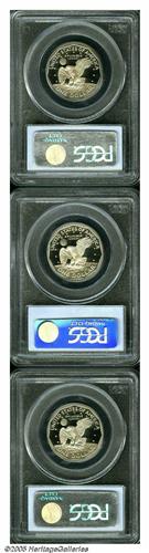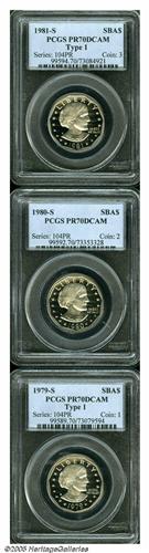 <B>1979-S<SBA$> Type One PR70 Deep Cameo PCGS,</B></I> a good strike, outstanding white on black contrast; <B>1980-S PR70 Deep Cameo PCGS,</B></I> hints of gold color, fully struck; and a <B>1981-S Type One PR70 Deep Cameo PCGS,</B></I> a decent strike, immaculate.<BR><I>From The Western Hills Collection.</B></I>